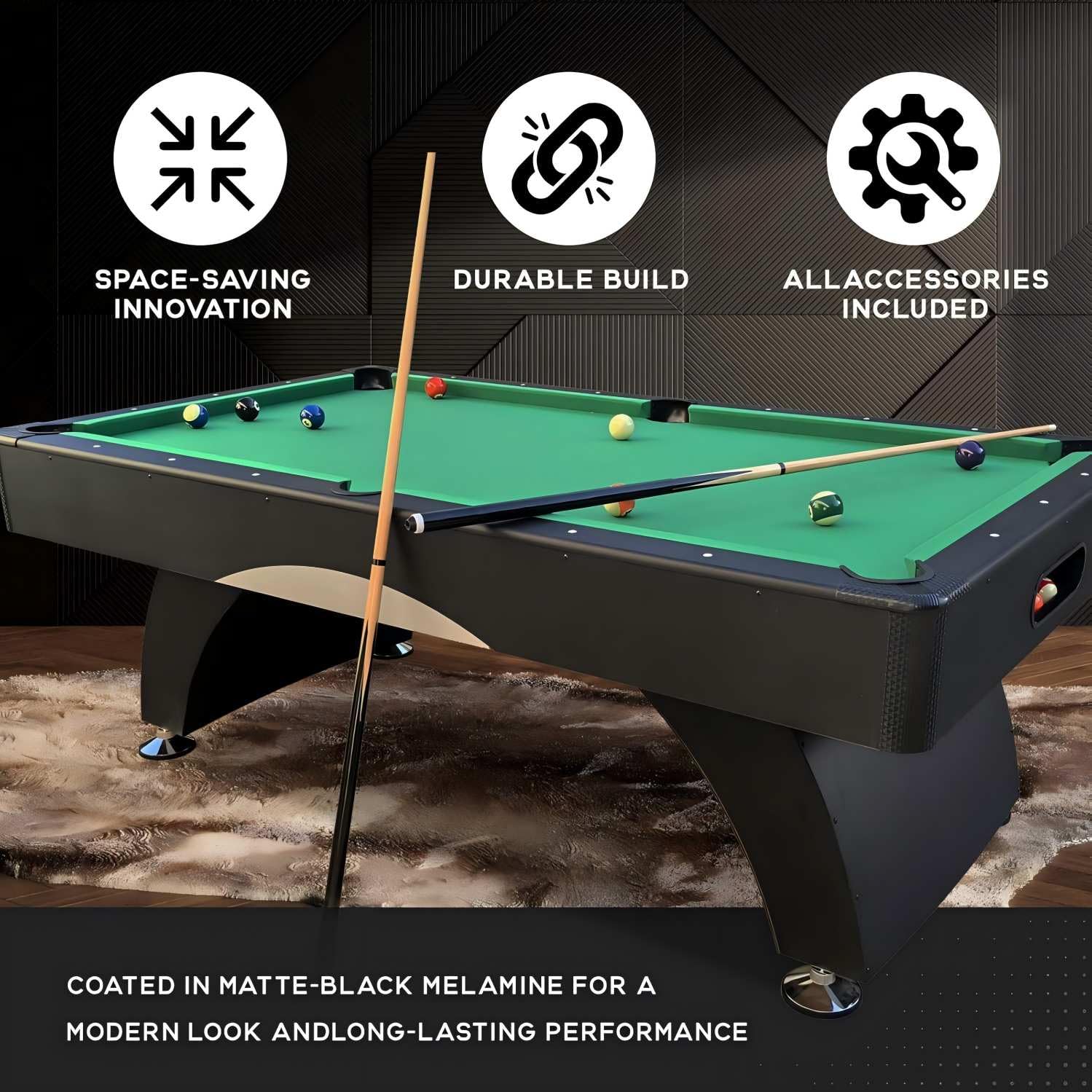 - Modern Design: Sleek matte-black finish with arched legs creates an elegant centerpiece for game rooms, offices, or entertainment spaces