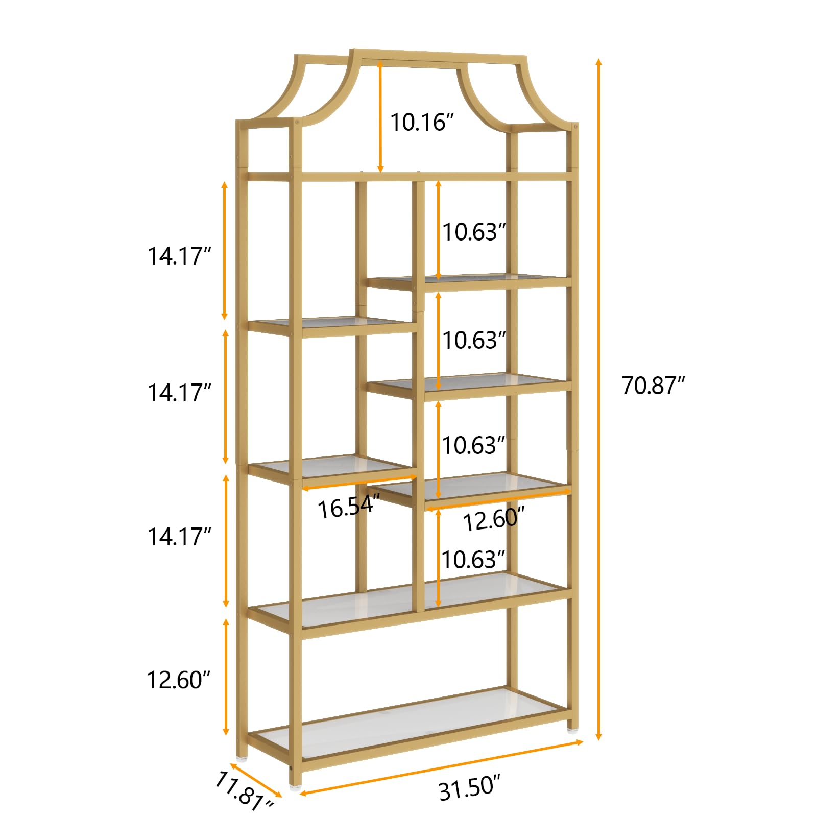 Transform your space with this stunning contemporary etagere bookshelf featuring eight staggered tempered glass shelves and a sophisticated gold metal frame. Perfect for displaying books, decorative items, plants, and cherished collectibles in your bedroom, home office, or living room.