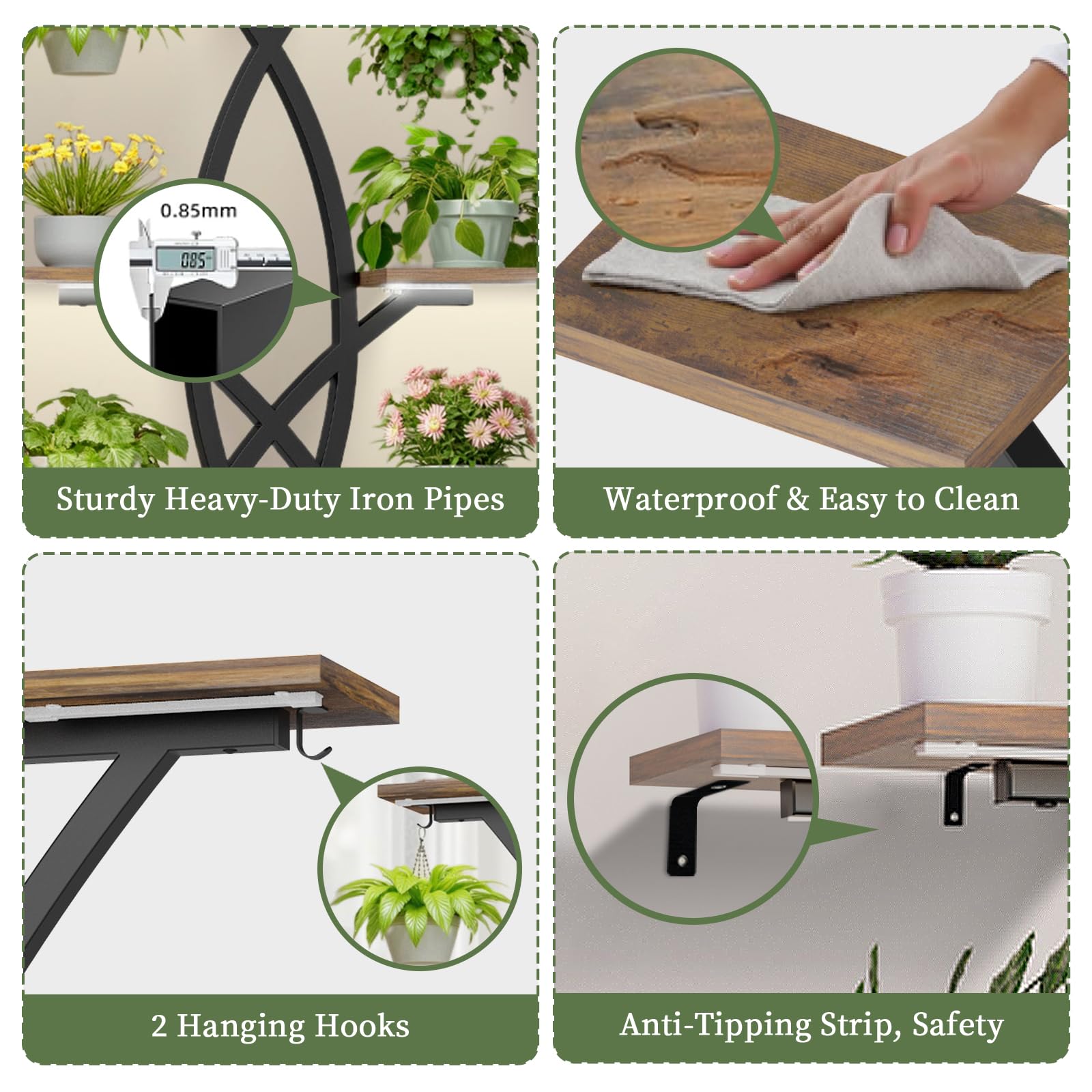 - Durable Construction: Built with 0.85mm thick rust-proof iron pipes and 15mm waterproof particle board. Designed to withstand daily watering and support heavy items with ease.