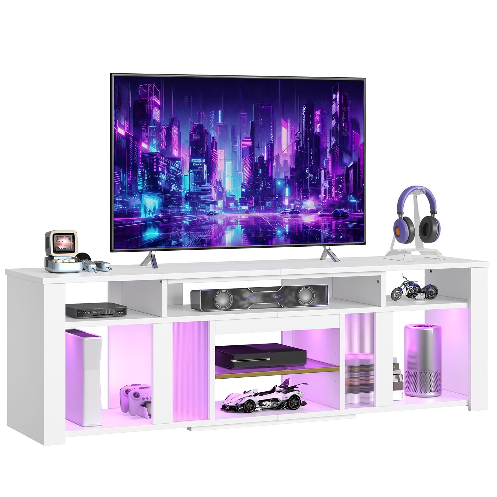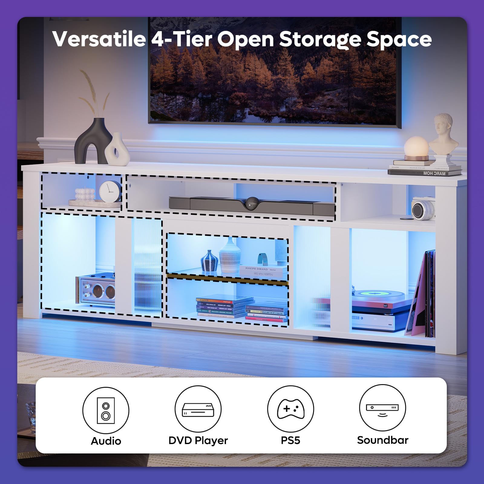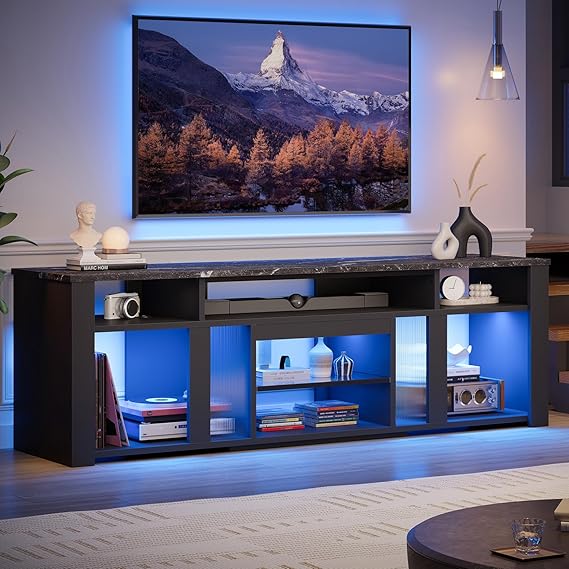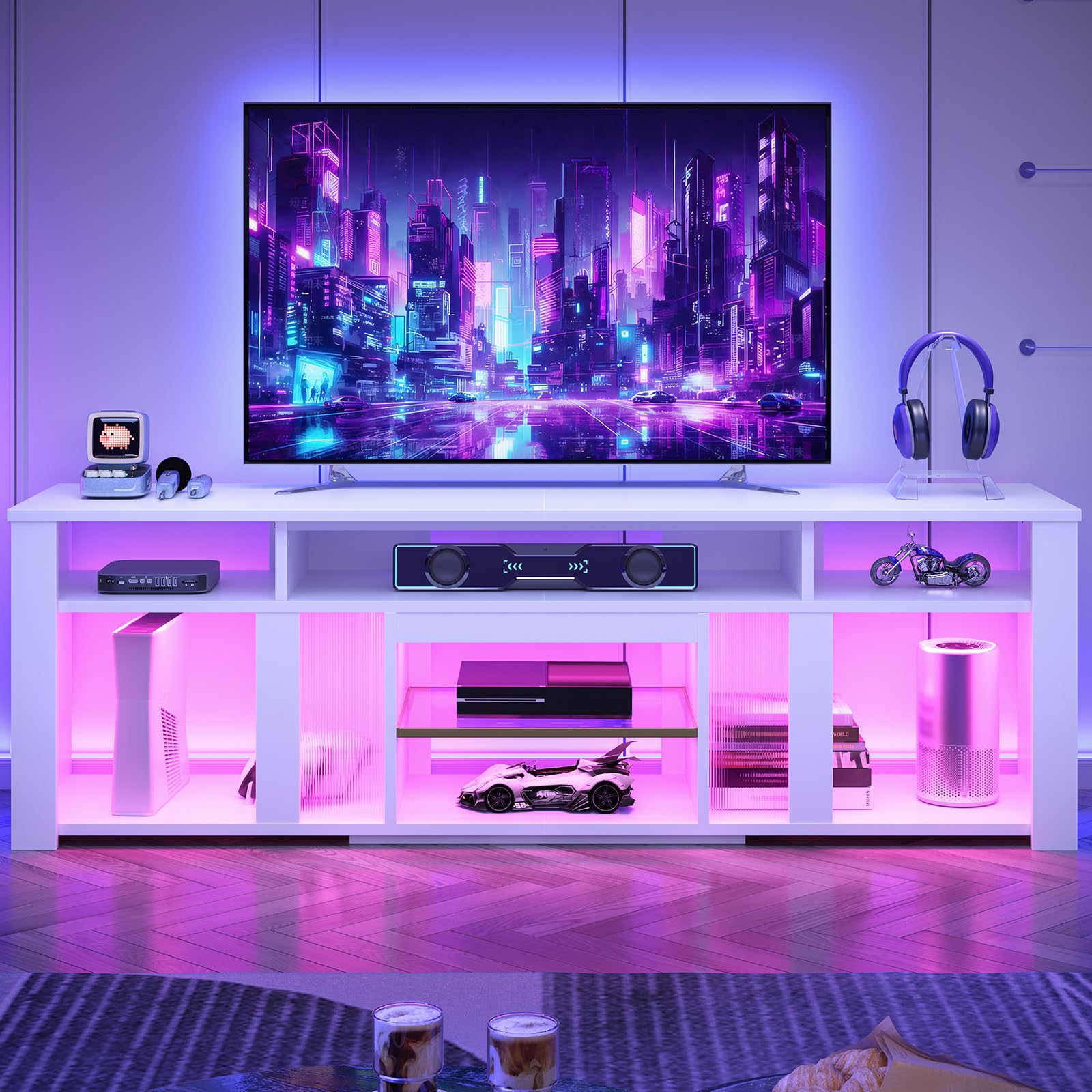 Transform your living space with this tall entertainment center designed to accommodate 65, 75, 85, and 90 inch TVs. This modern TV console features integrated LED lighting and adjustable shelving to organize your media equipment and accessories.