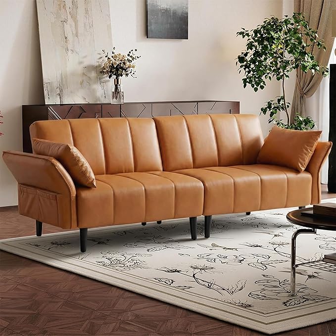83" Faux Leather Futon Couch - Mid Century Modern Convertible Sofa