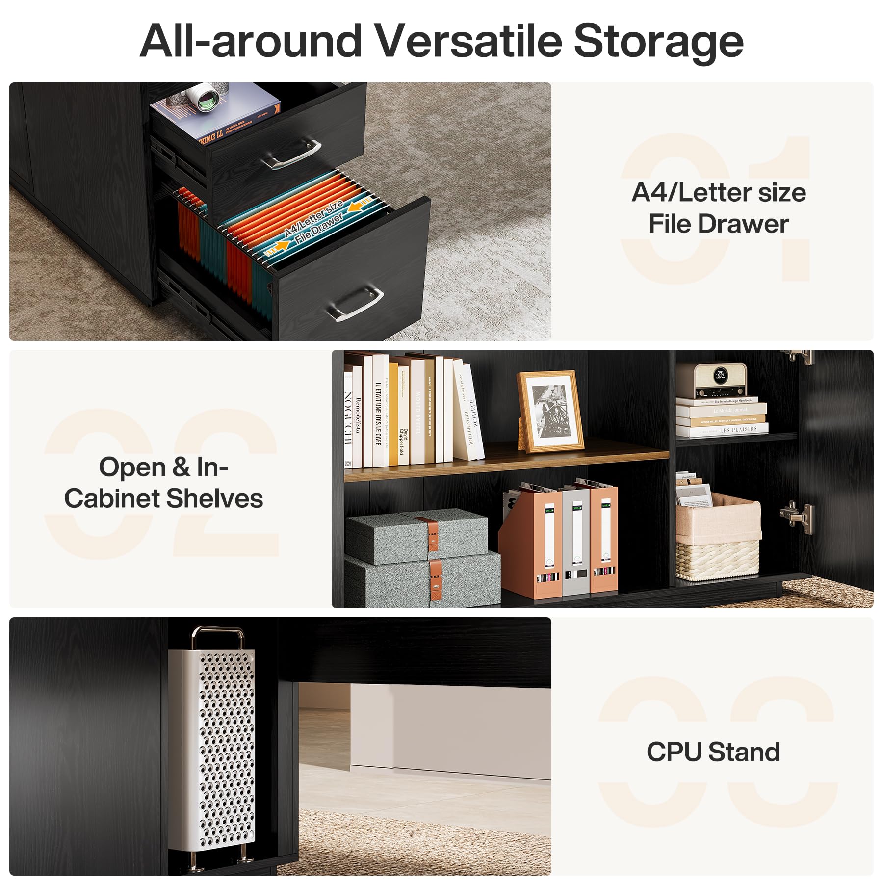 - Integrated file drawers for organized document storage
