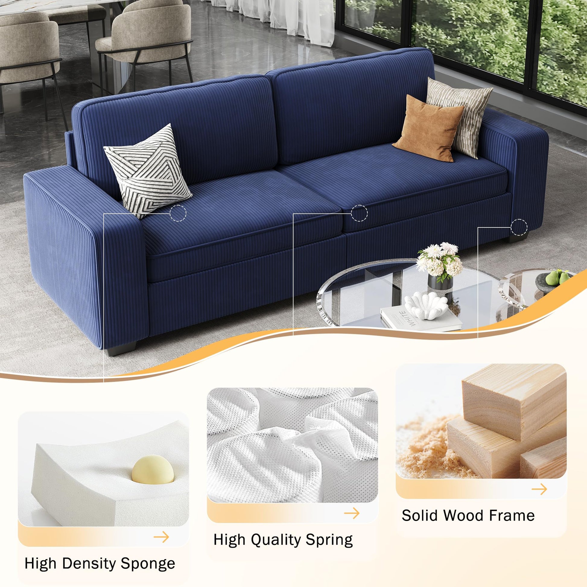 86" Blue Corduroy Sofa with Deep Seats
