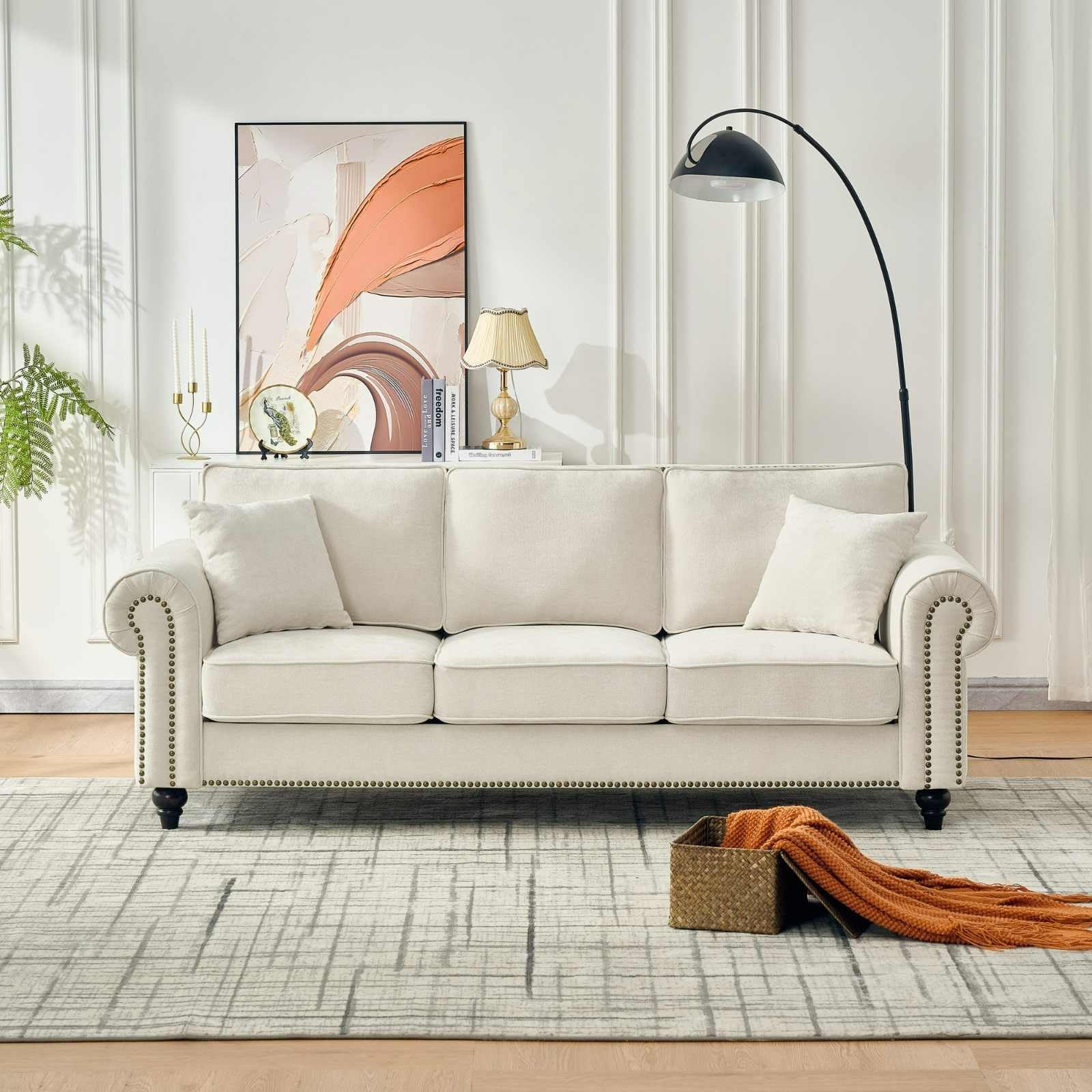 This elegant 86.5" sofa combines classic design with modern comfort, featuring rolled arms adorned with decorative nailhead trim and sturdy pine wood legs. Upholstered in premium chenille fabric and filled with high-density foam cushions, this 3-seater couch offers a luxurious medium-soft seating experience that resists sagging over time.