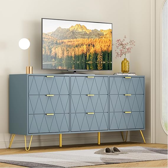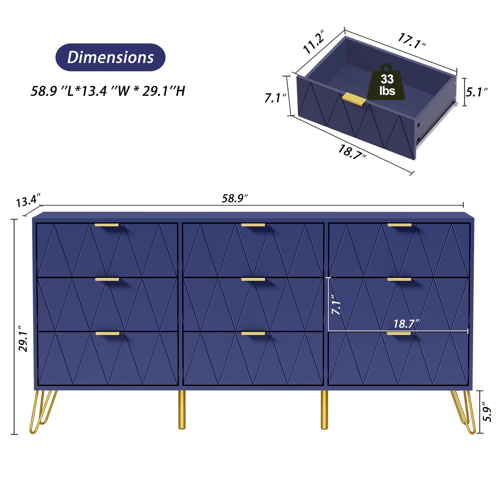 This elegant 9-drawer dresser combines functionality with sophisticated design, featuring luxurious gold handles that add a premium touch to any bedroom, closet, or living room. The navy blue finish creates a striking focal point while providing ample storage space across nine deep drawers.