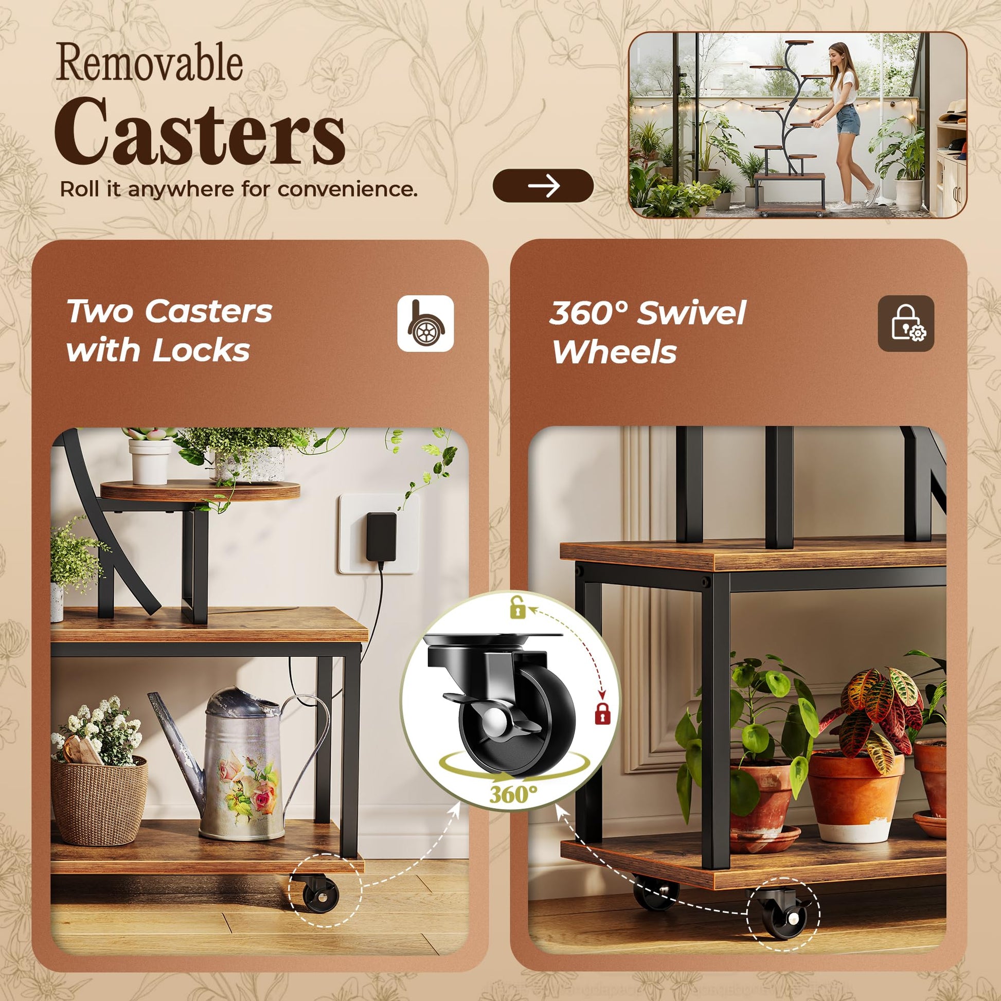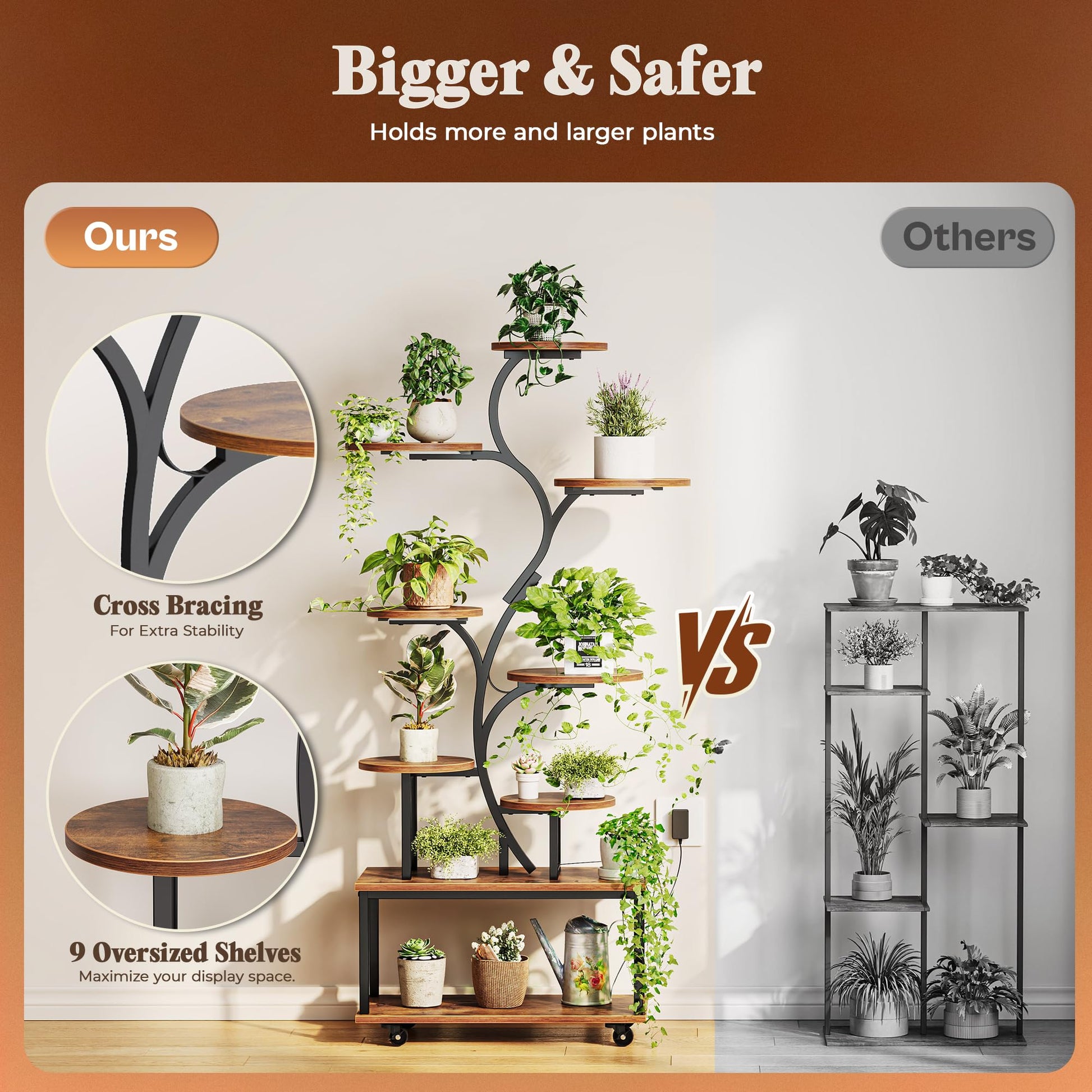 This 63.6-inch tall, 9-tier plant rack maximizes vertical space, turning unused corners into vibrant plant displays. Larger shelves accommodate bigger pots, allowing your plants room to grow while keeping everything organized. The open bottom shelf provides convenient storage for gardening tools and supplies.