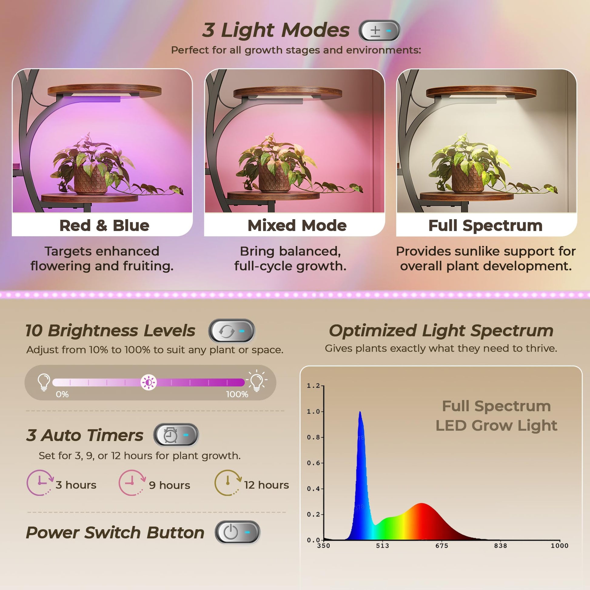 Equipped with 4 LED grow lights offering 3 customizable light modes (Full Spectrum, Red & Blue, and Mixed), 10 brightness levels, and programmable timers (3/9/12 hours). The memory function automatically maintains your preferred settings, making daily plant care effortless.