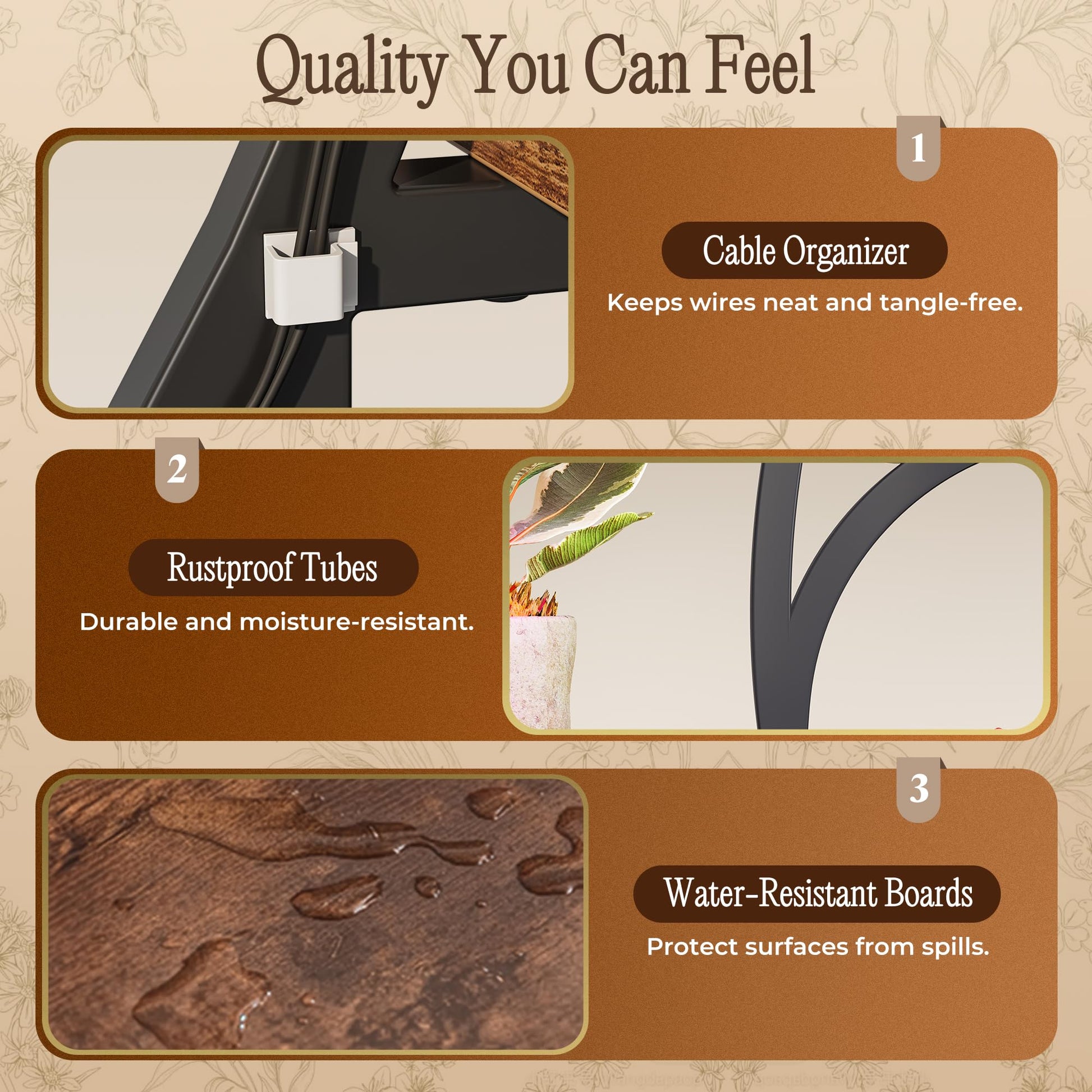 Built with a robust metal frame, thick engineered wood boards, and anti-rust coating for long-lasting durability. The waterproof surface resists moisture and is easy to clean. Smooth-rolling wheels enable effortless repositioning, while integrated cable clips maintain a tidy appearance.