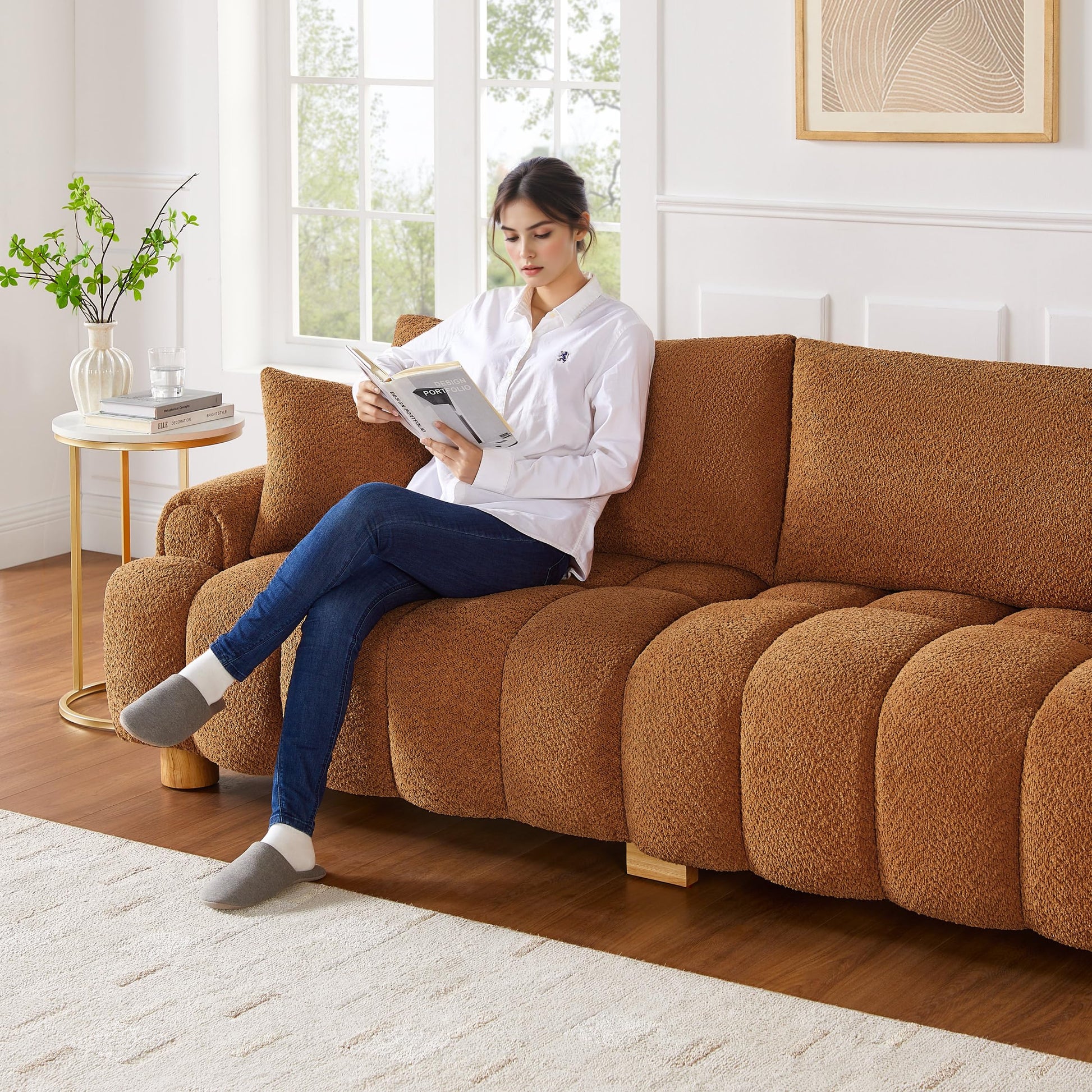 Crafted with excellent boucle fabric that is soft, breathable, hard-wearing, and wrinkle-resistant. The surfaces are filled with high-density thick sponge and equipped with springs for lasting elasticity and comfort that won't collapse over time.