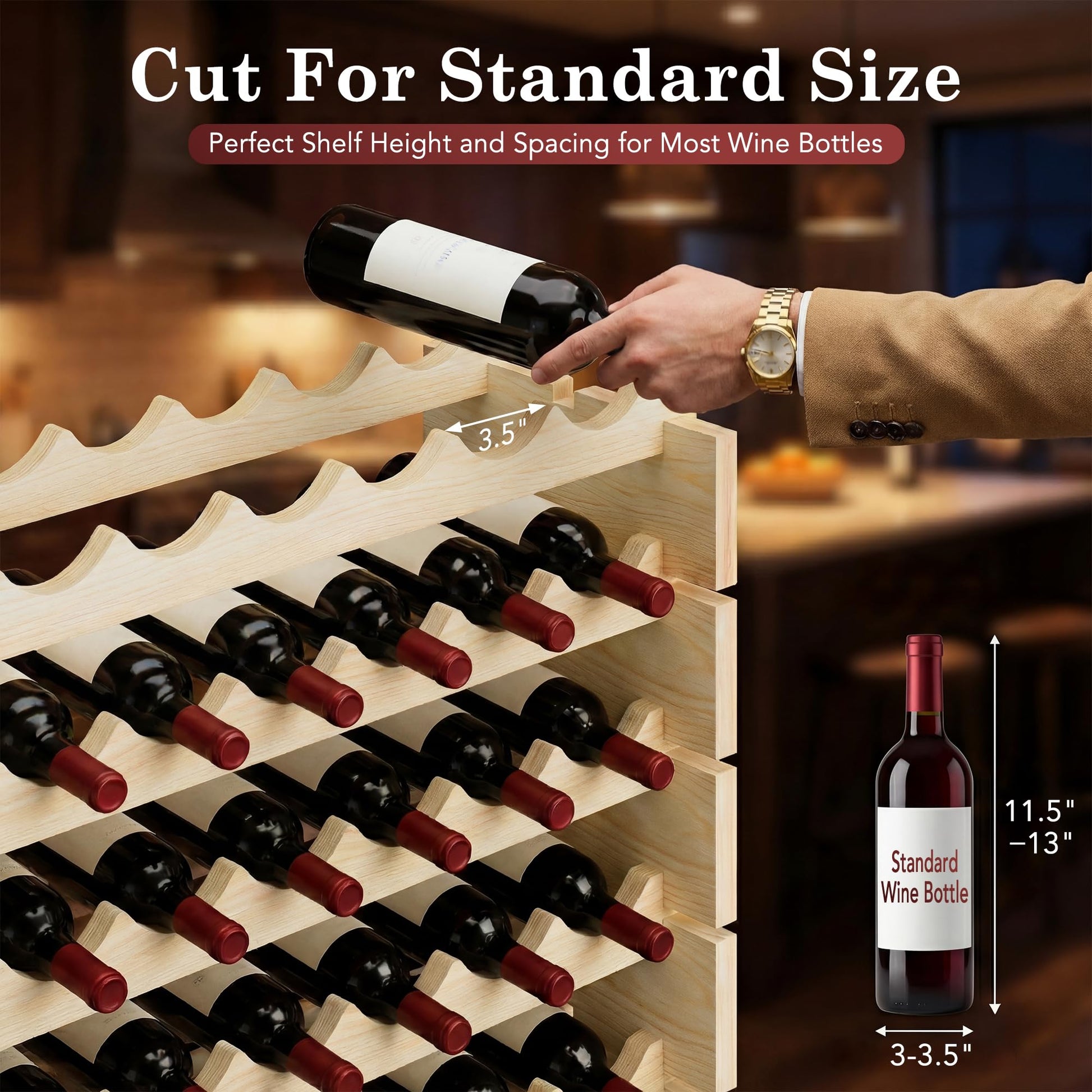 This 96-bottle stackable modular wine rack offers a classic and practical storage solution for wine enthusiasts. Featuring 8 tiers with wave-shaped shelves, this freestanding wine holder accommodates up to 96 standard 750ml wine bottles with 3.5-inch openings per slot.