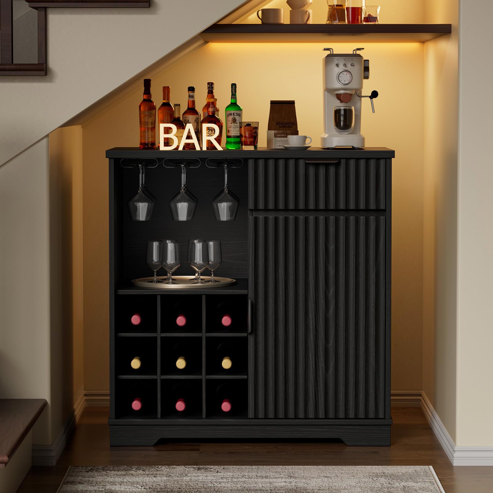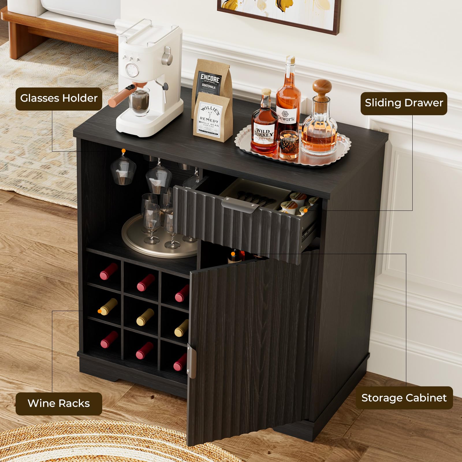 - Elegant Fluted Design: The black bar cabinet paired with a woodgrain top and modern fluted panels, elevating your coffee bar cabinet into a stylish focal point. A clean solution for small kitchens, dorms, or home bar setups.