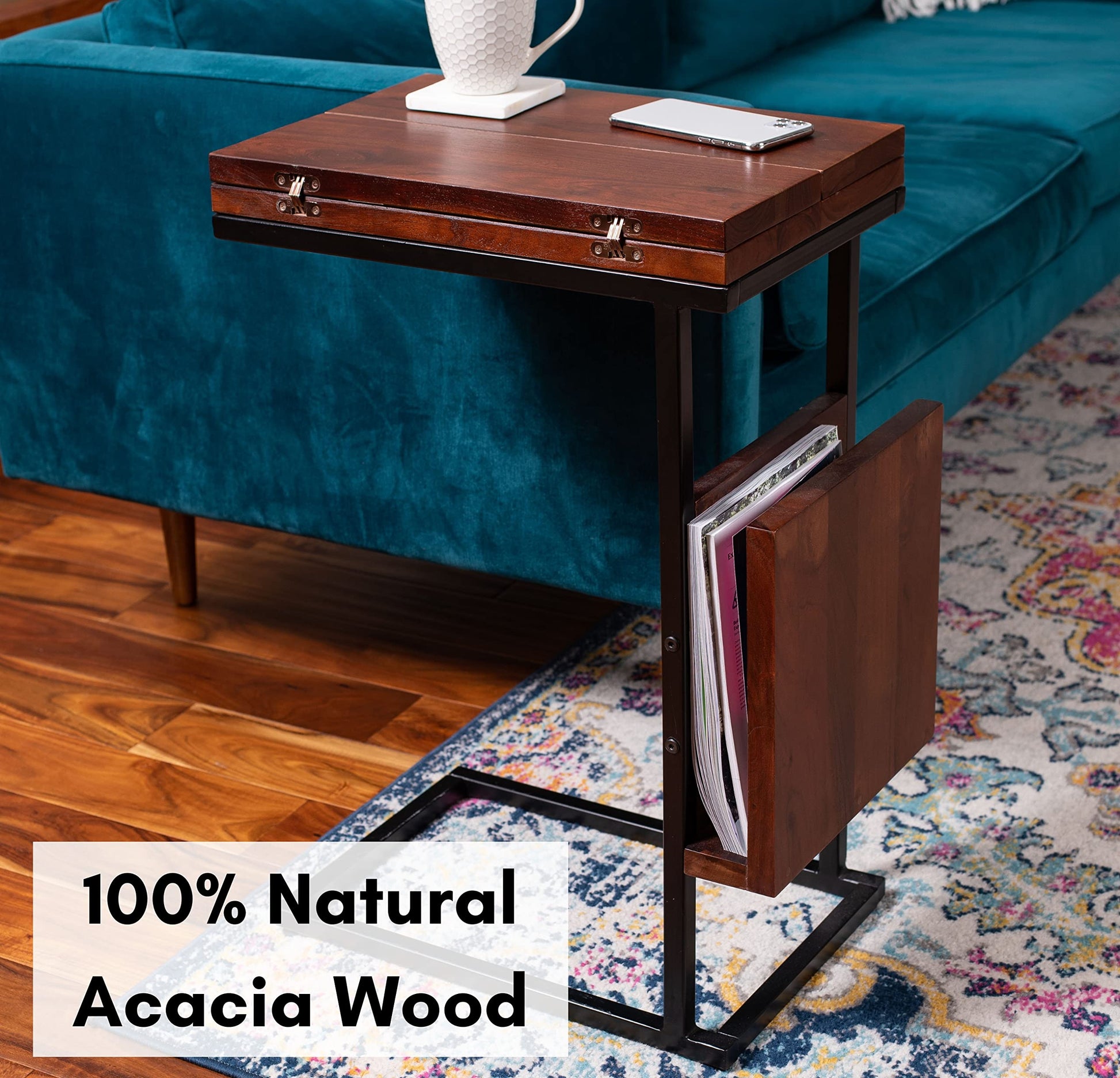 Transform your living space with this versatile C-shaped side table crafted from 100% natural acacia wood. The innovative design slides effortlessly under low-clearance sofas, providing a convenient surface for snacks, beverages, laptops, tablets, and reading materials.
