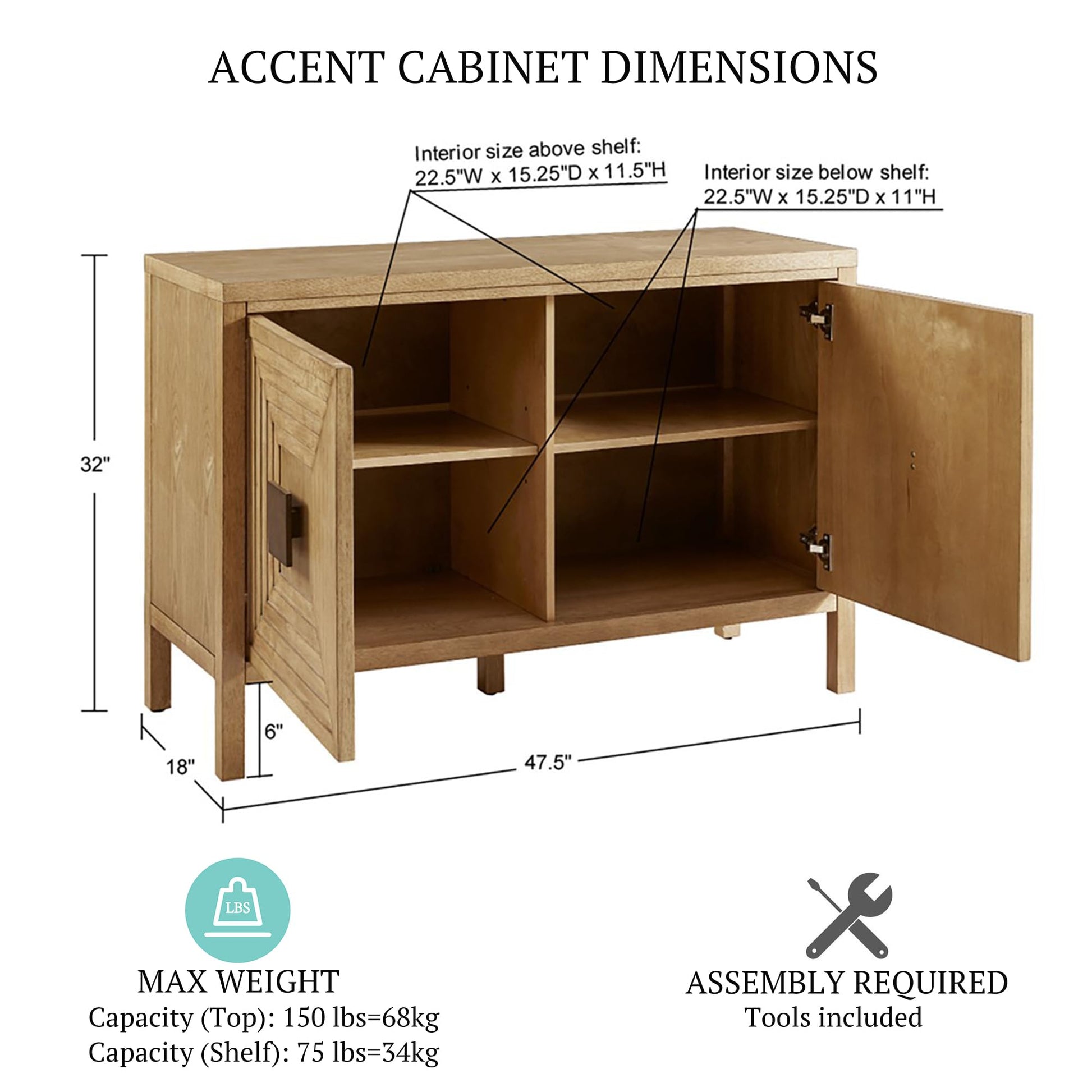 This elegant accent storage cabinet combines functionality with sophisticated design, featuring a natural woodgrained finish and geometric patterns that complement any living space. Built with solid wood legs for durability and stability, this versatile piece offers ample storage with two adjustable shelves to accommodate items of various sizes.