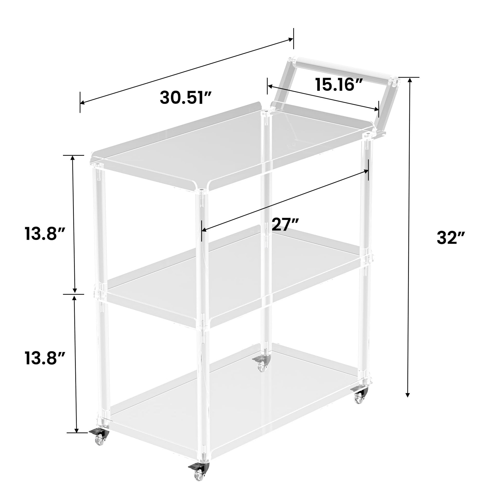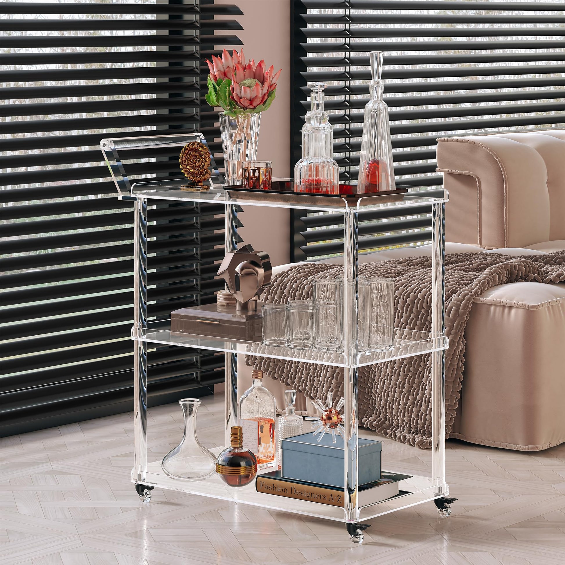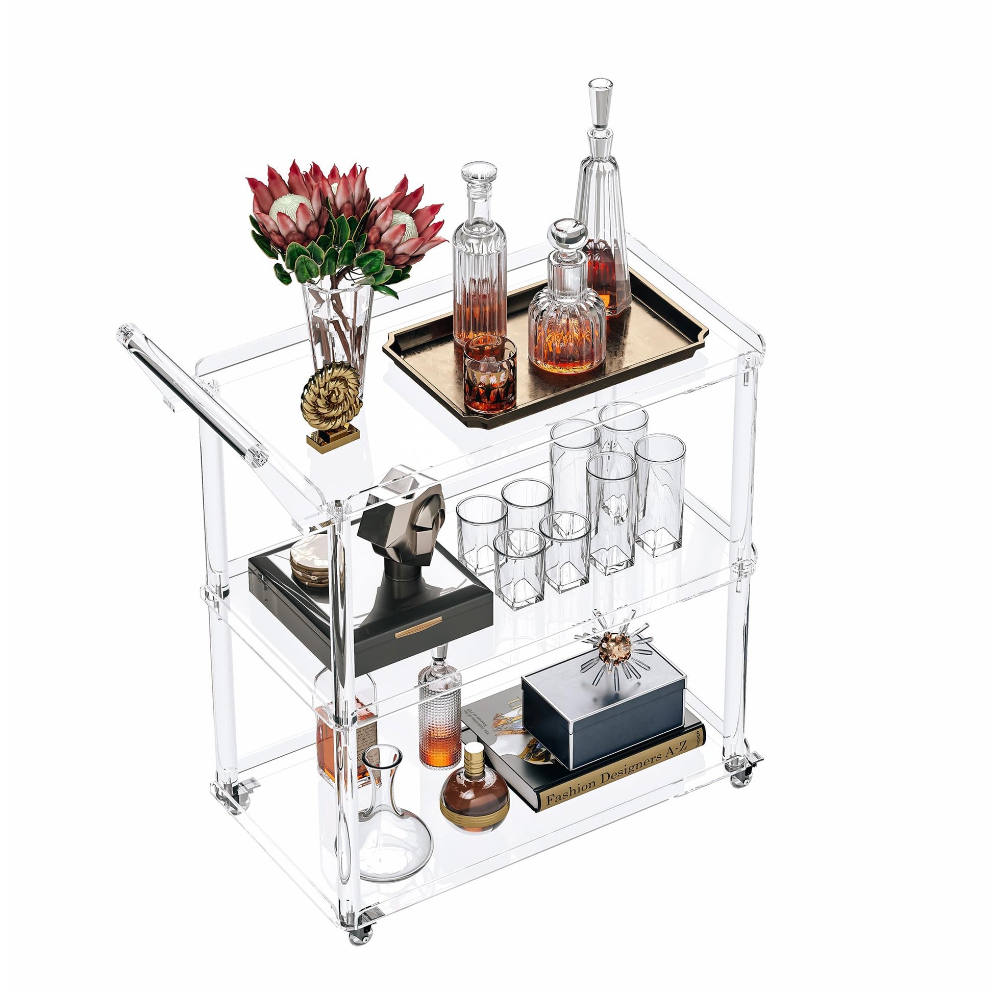Premium 3-tier rolling bar cart crafted from 100% high-quality acrylic material. Features lockable wheels, ergonomic pulling handle, and spacious storage design perfect for home bar, kitchen, or living room use.