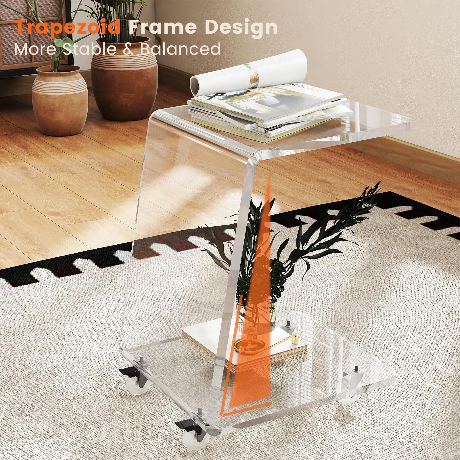 Elevate your living space with this modern clear acrylic side table featuring a unique trapezoid frame design. This versatile C-shaped table seamlessly blends functionality with contemporary aesthetics, making it the perfect addition to your living room, bedroom, or home office.