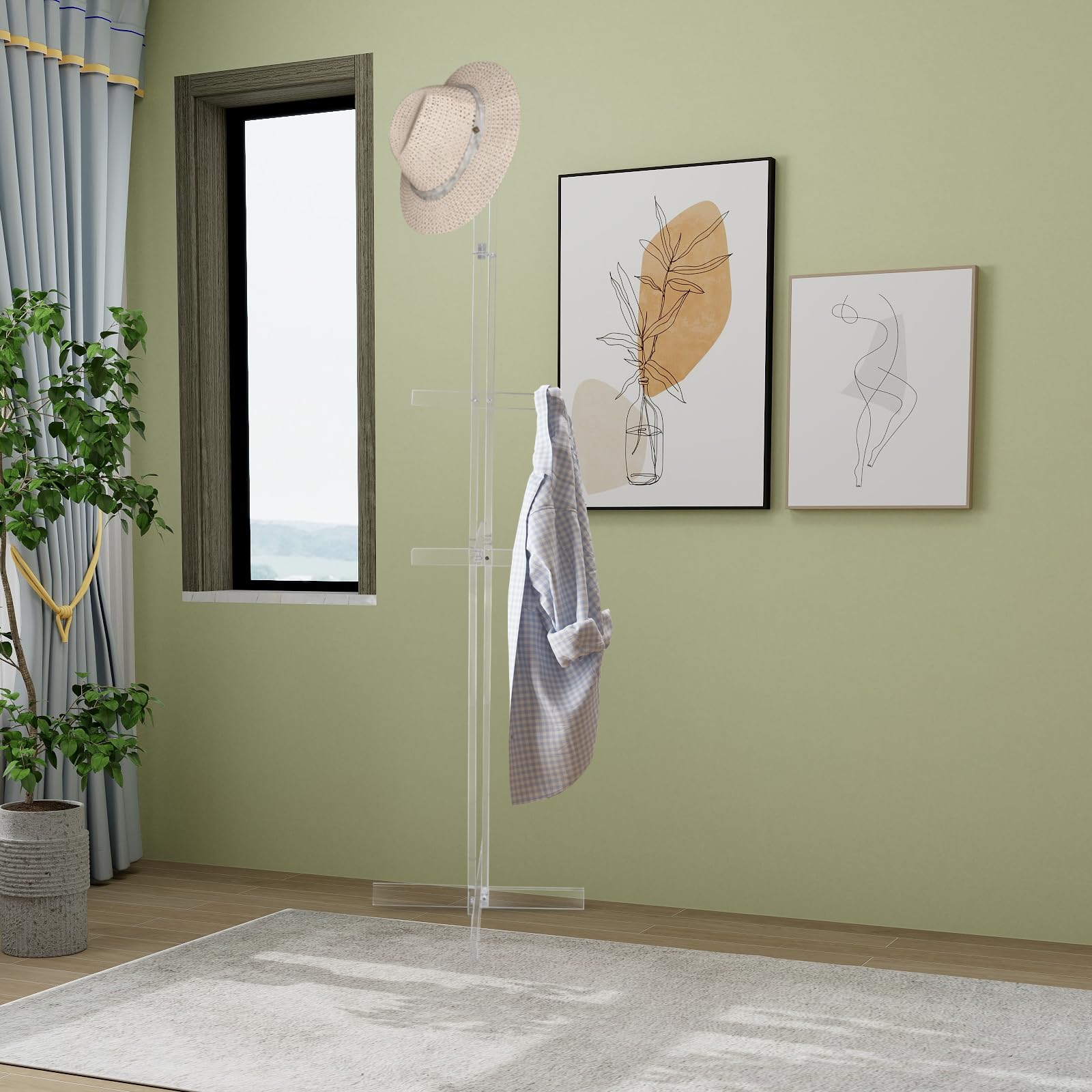 This modern freestanding coat rack combines sleek acrylic design with practical functionality, featuring 10 sturdy hooks to organize your coats, handbags, hats, and scarves. The anti-slip strips ensure stability on any floor surface, making it perfect for entryways, offices, bedrooms, or hallways.