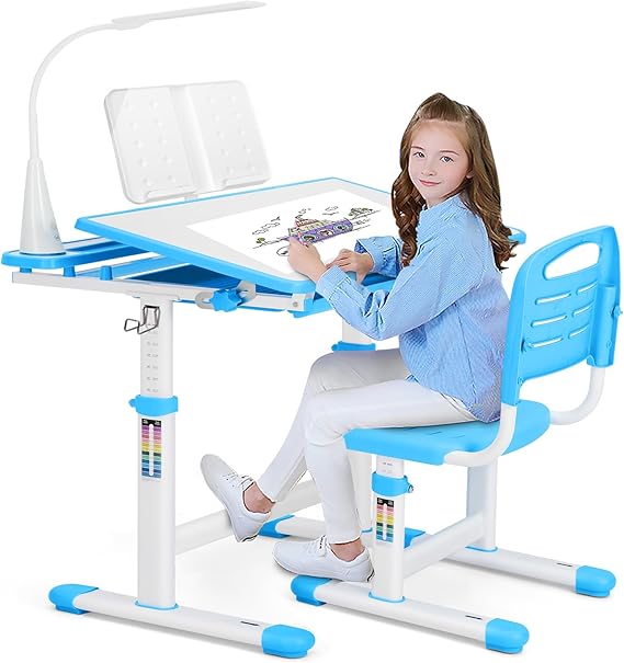 Adjustable Kids Study Desk and Chair Set with LED Lamp