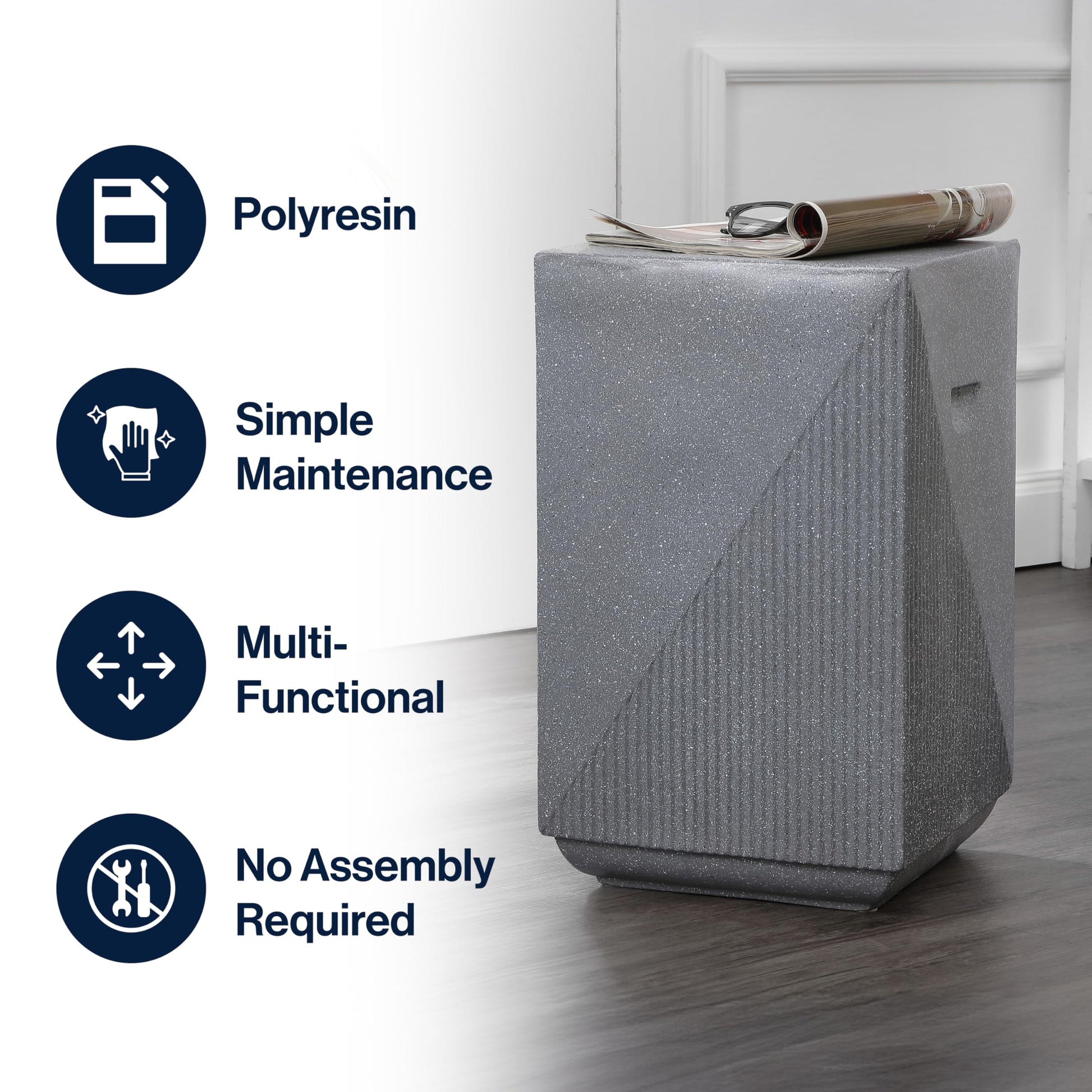 Contemporary minimalist square accent table designed for versatile indoor and outdoor use. Features a durable gray terrazzo finish that complements modern, mid-century, art deco, and contemporary design aesthetics. Perfect for patios, gardens, bathrooms, and living rooms.