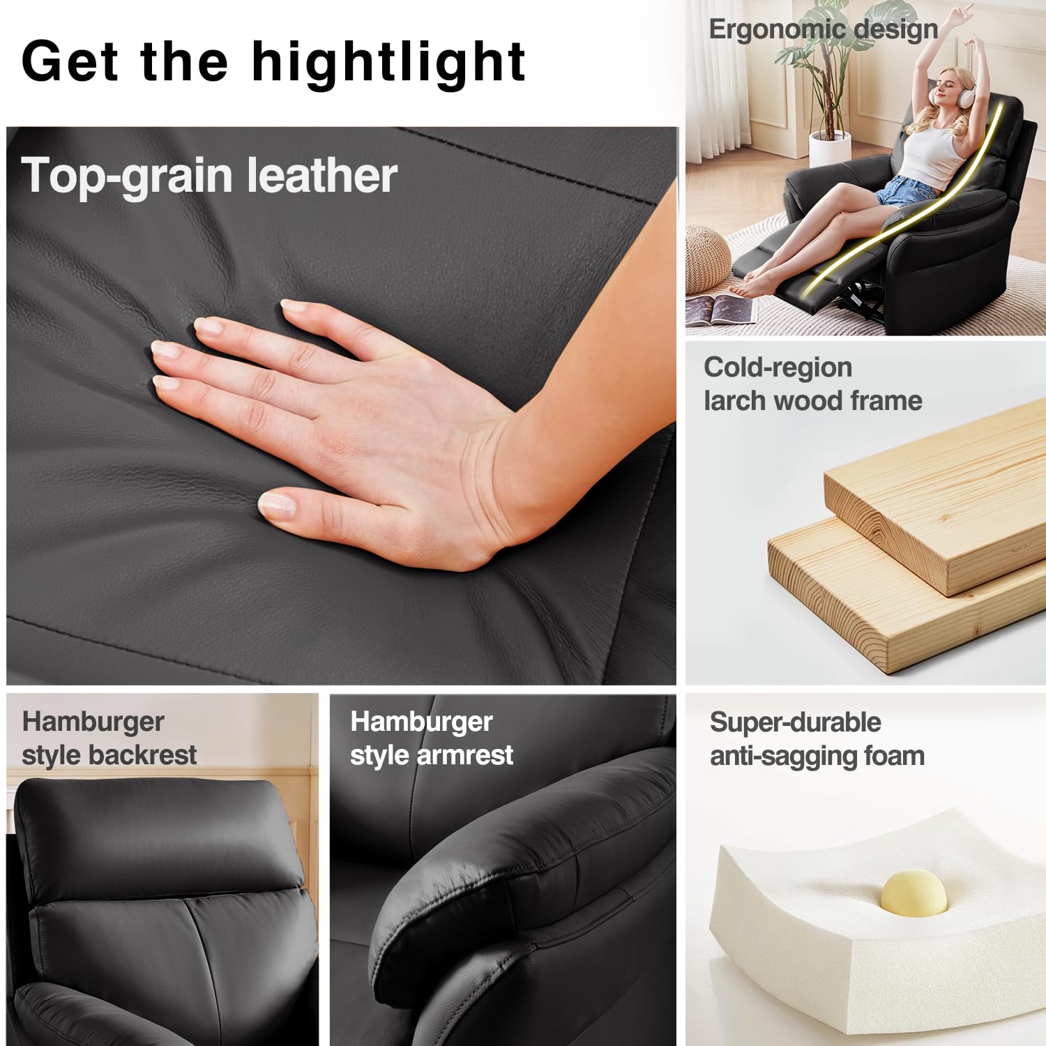 AIRSKY Genuine Leather Recliner Chair, Top Grain Leather, Italian Water-Washing Process, Reclining Sofa Chair for Reading, Single Sofas for Living Room, Theater Seating, Bedroom. Black,R1
