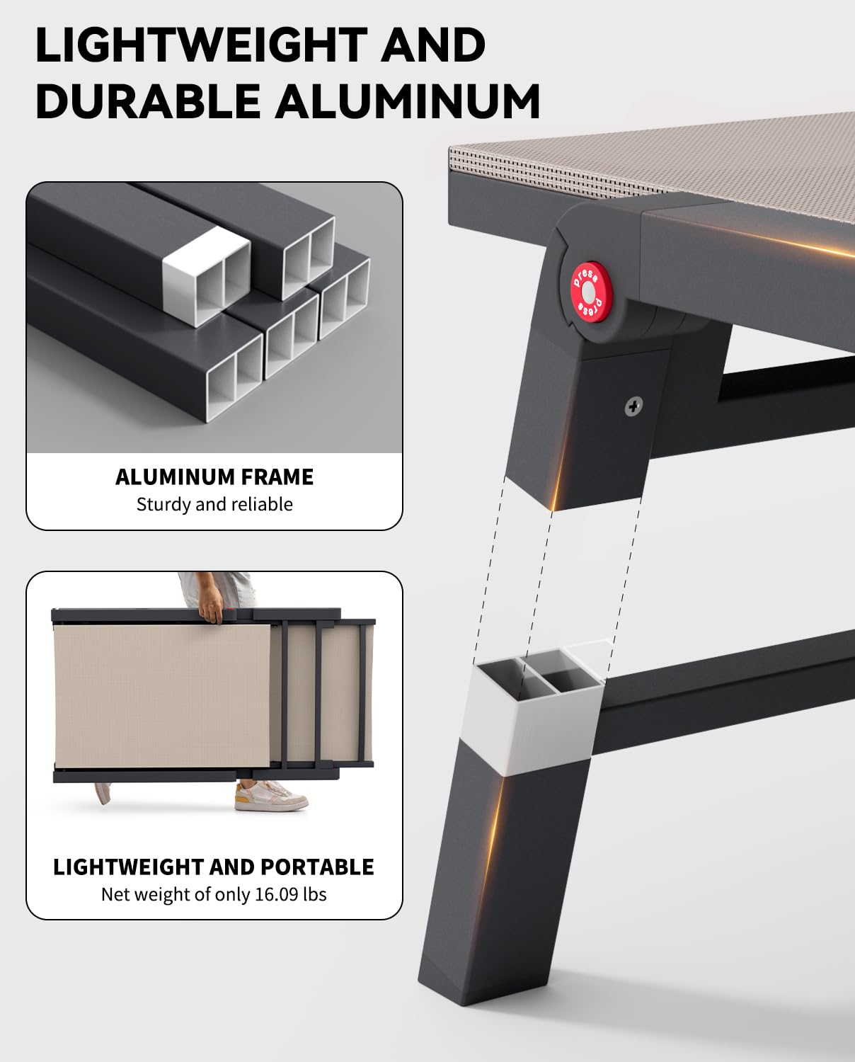 Durable & Lightweight Construction: Built with a powder-coated aluminum frame that resists rust and corrosion for long-lasting outdoor use. Thickened tube walls provide exceptional stability, supporting up to 400 pounds while remaining lightweight for effortless portability.