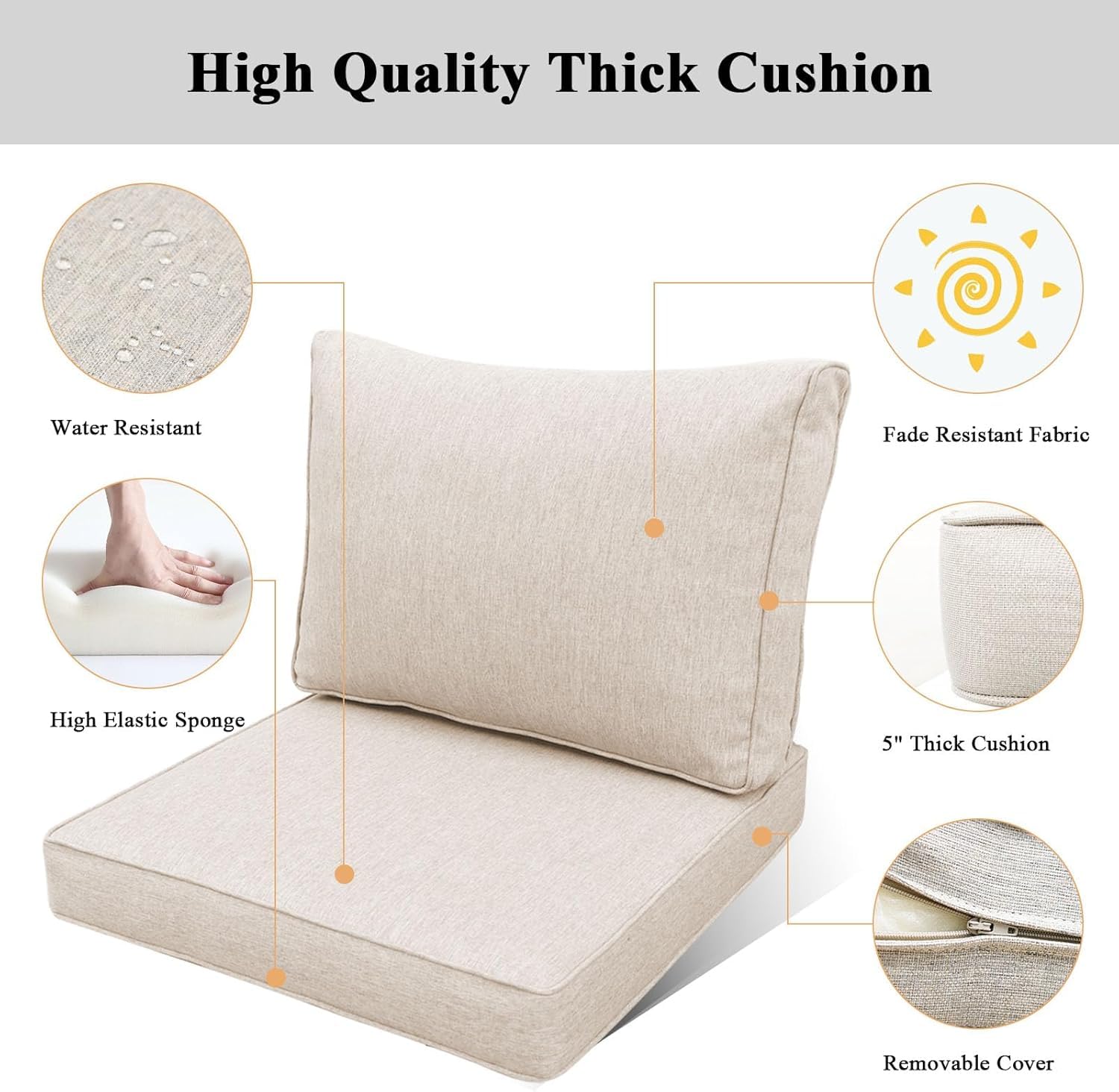 Comfortable Seating: Features 5-inch thick cushions filled with high-resilience sponge for exceptional comfort. Cushion covers are made from high-grade, splash-proof polyester fabric that resists dirt, heat, and fading. Removable covers make cleaning effortless.