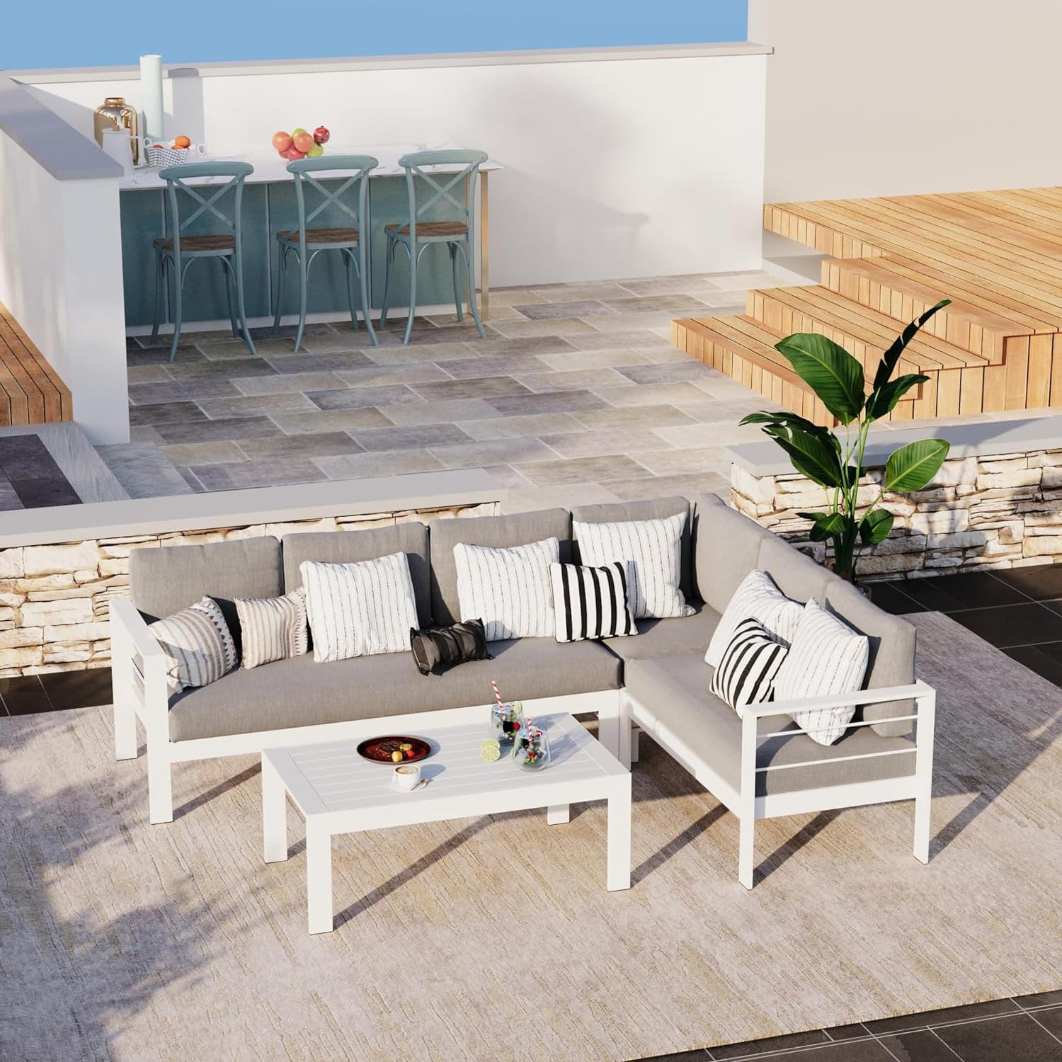 Transform your outdoor space with this modern aluminum patio furniture set. This complete sectional sofa configuration includes a stylish coffee table with imitation wood tabletop, perfect for balconies, backyards, and outdoor living areas.