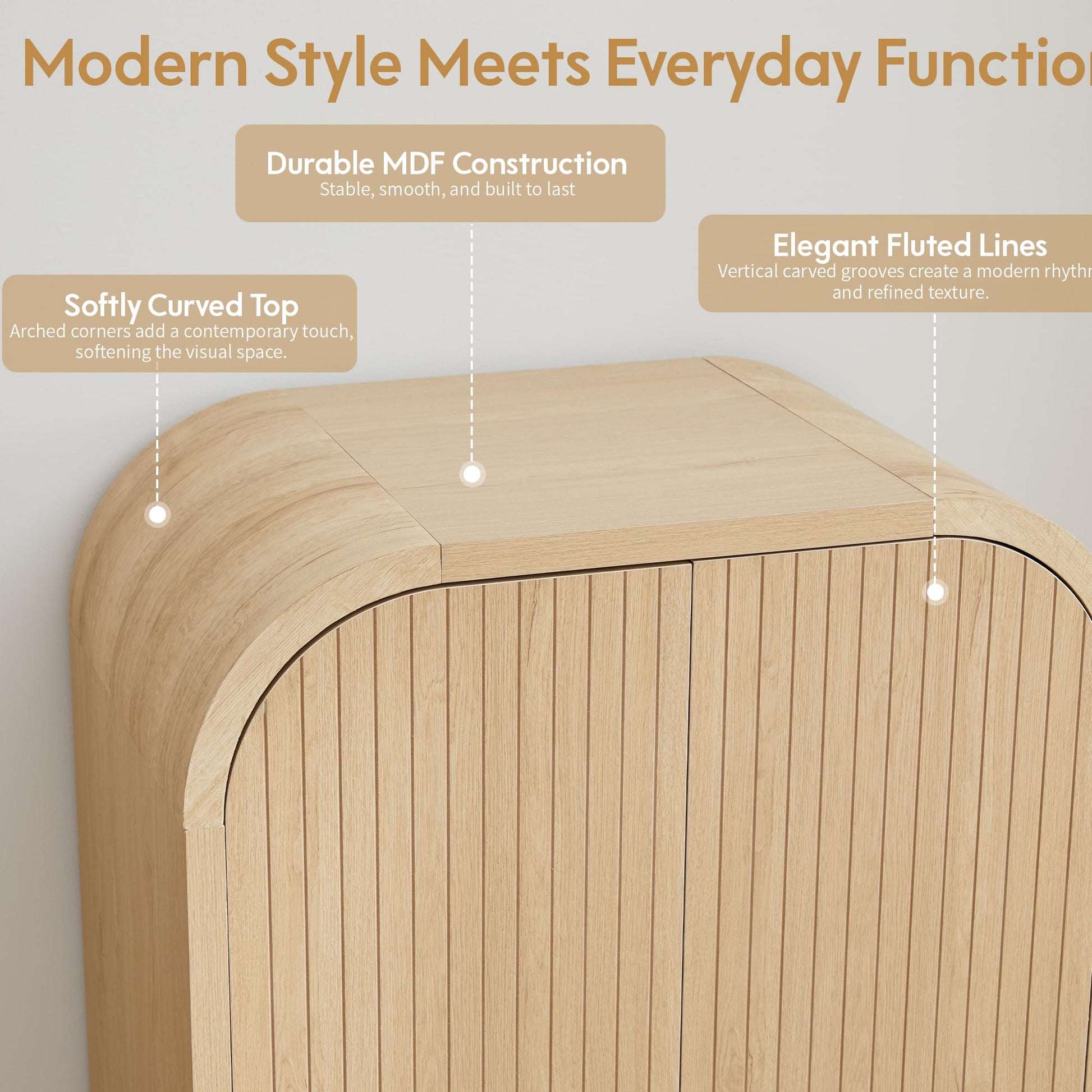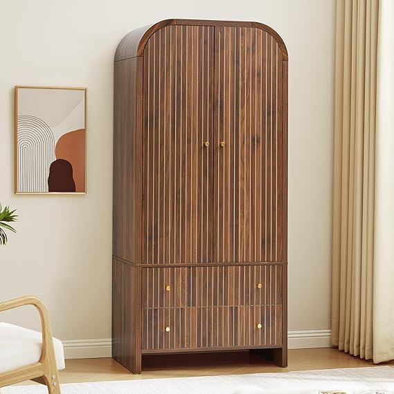 This mid-century modern arched armoire wardrobe combines elegant design with practical storage solutions for your bedroom. The distinctive arched top and vertical fluted detailing create a soft yet striking visual appeal, while the smooth walnut wood grain finish and gold-tone handles add a sophisticated touch to any space.