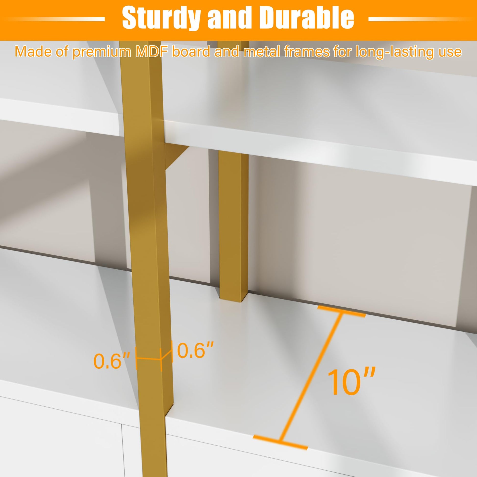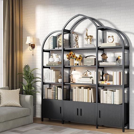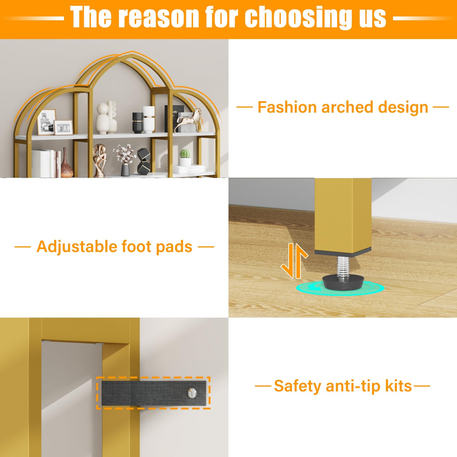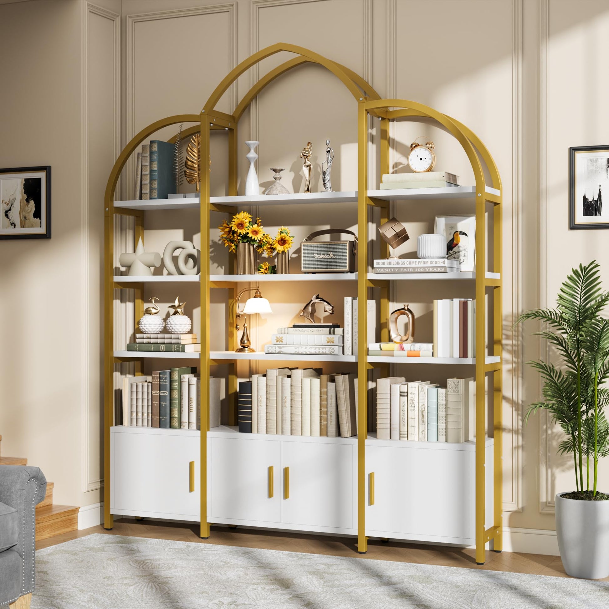 This tall arched bookshelf combines modern industrial design with functional storage. Featuring a distinctive arched top with black metal frames in gold and white finish, this triple-wide bookcase offers versatile storage for any room in your home.