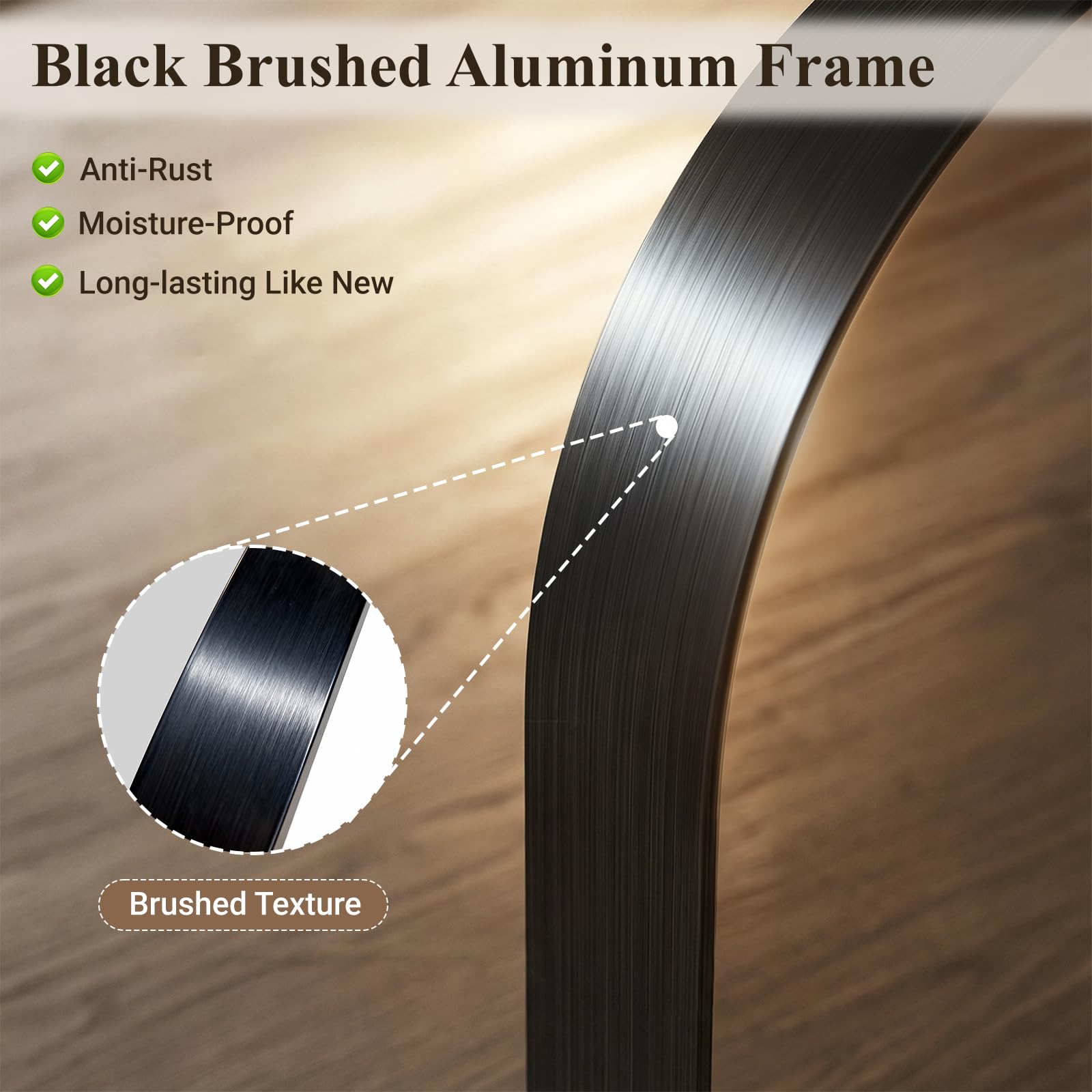 - Black Brushed Aluminum Frame: One-piece deep frame with textured finish is scratch-resistant, rust-proof, and moisture-resistant for long-lasting durability in humid environments