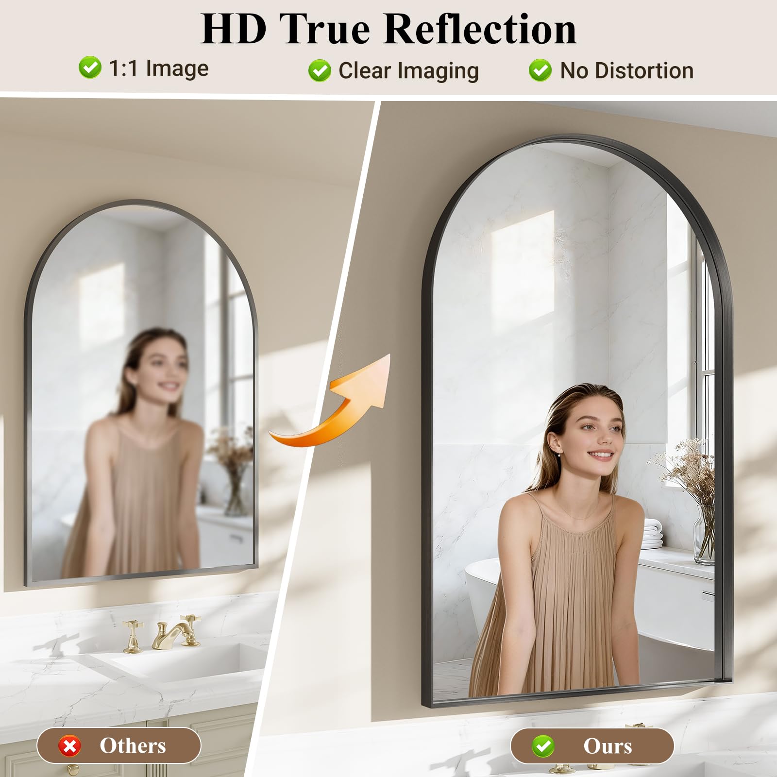 This arched wall mirror combines contemporary design with premium construction, featuring ultra-HD reflection technology and shatterproof tempered glass. The sleek black brushed aluminum frame offers durability and moisture resistance, making it perfect for bathrooms, bedrooms, entryways, and living rooms.