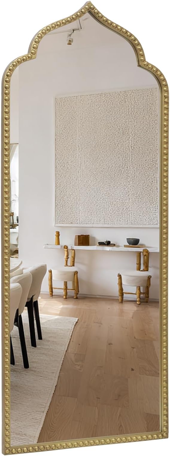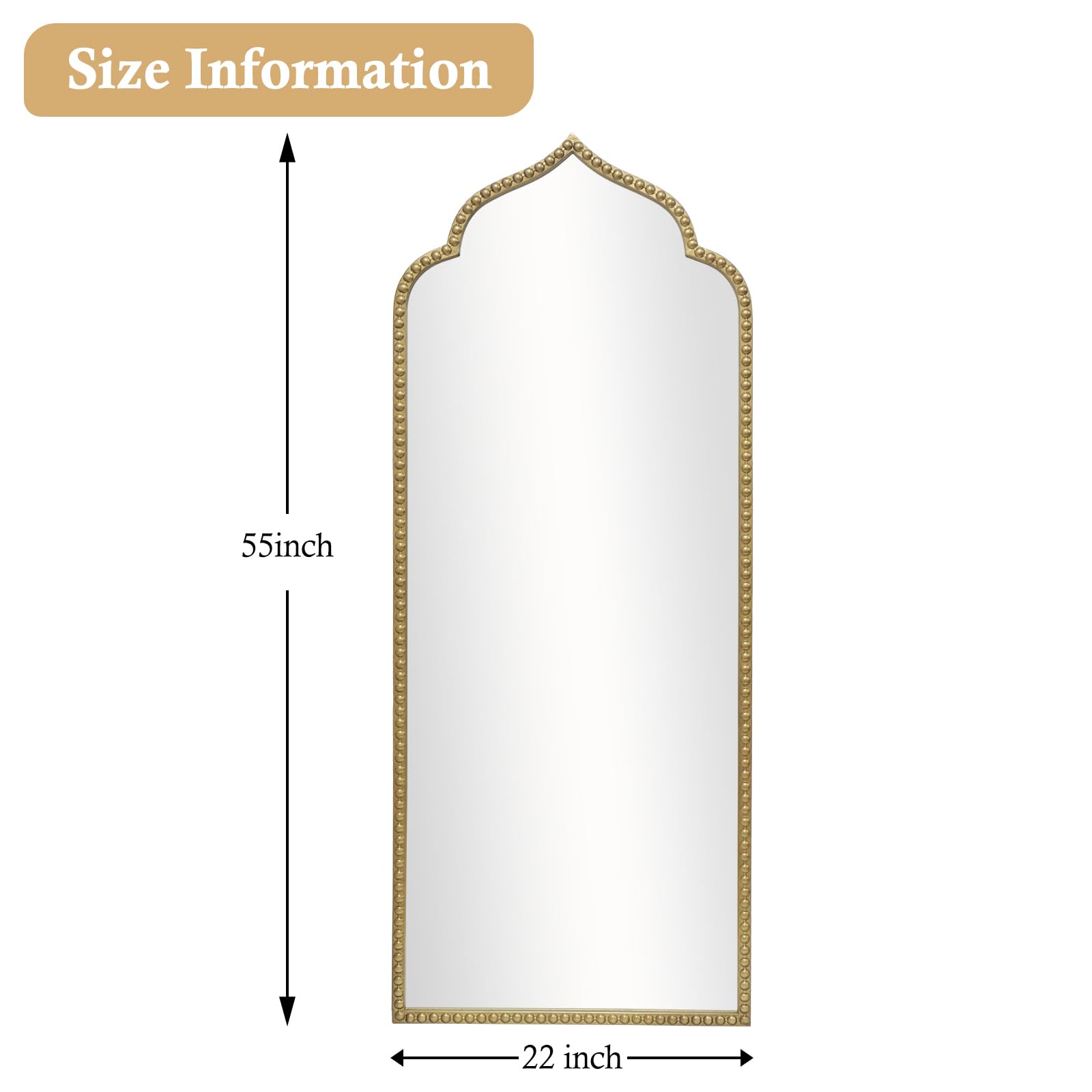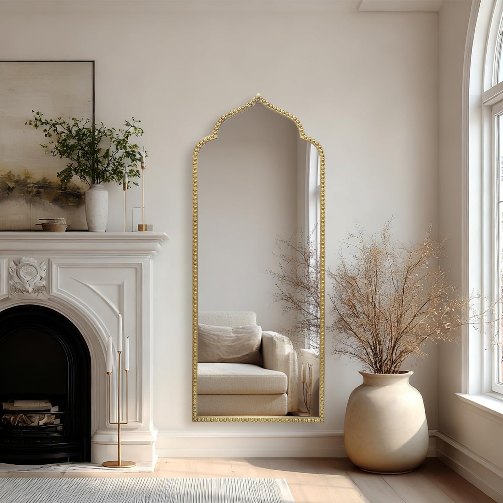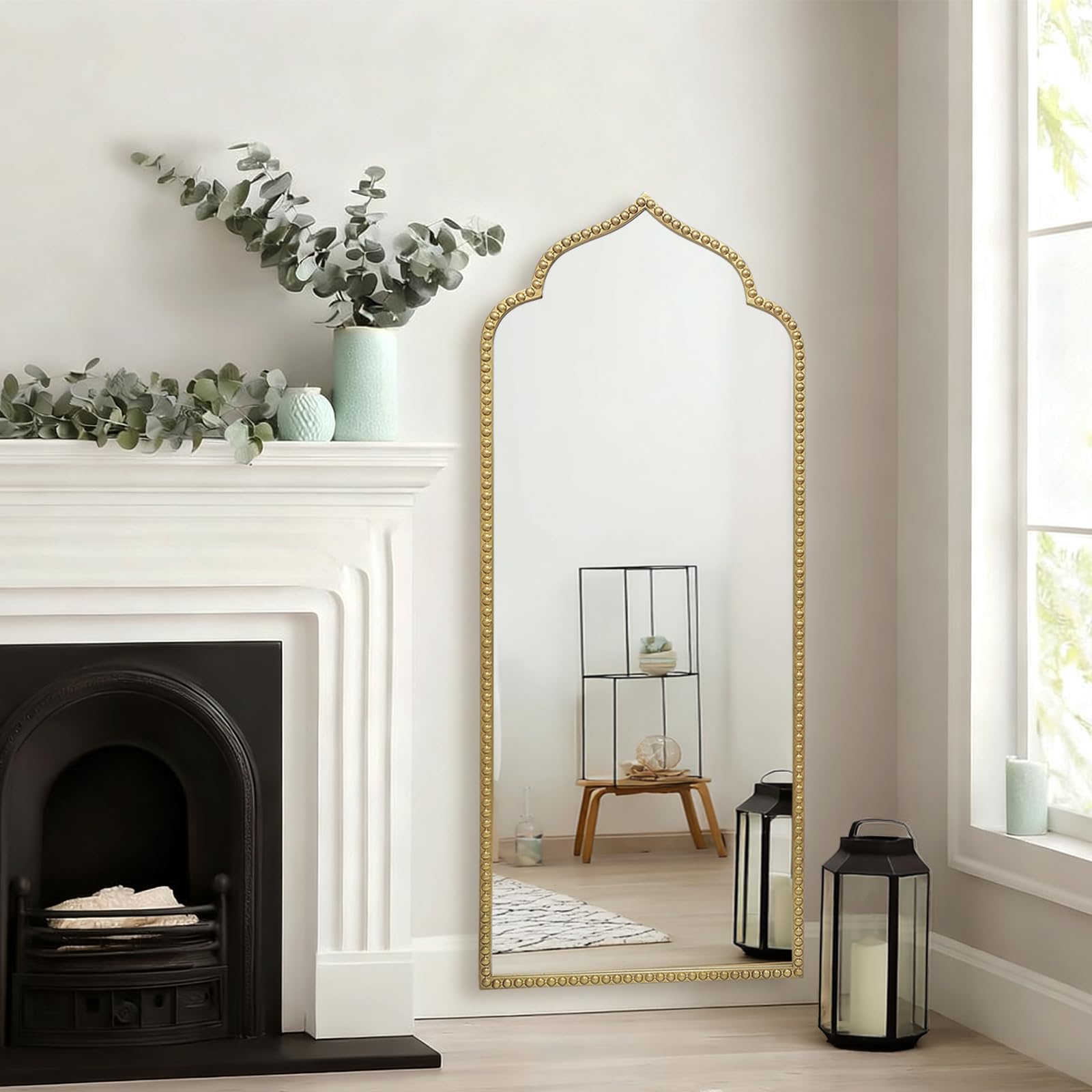 This stunning arched wall mirror features a Moroccan-inspired design with an elegant metal beaded frame in vintage gold finish. The high-definition glass provides crystal-clear reflections, making it both a functional and decorative statement piece for any room.