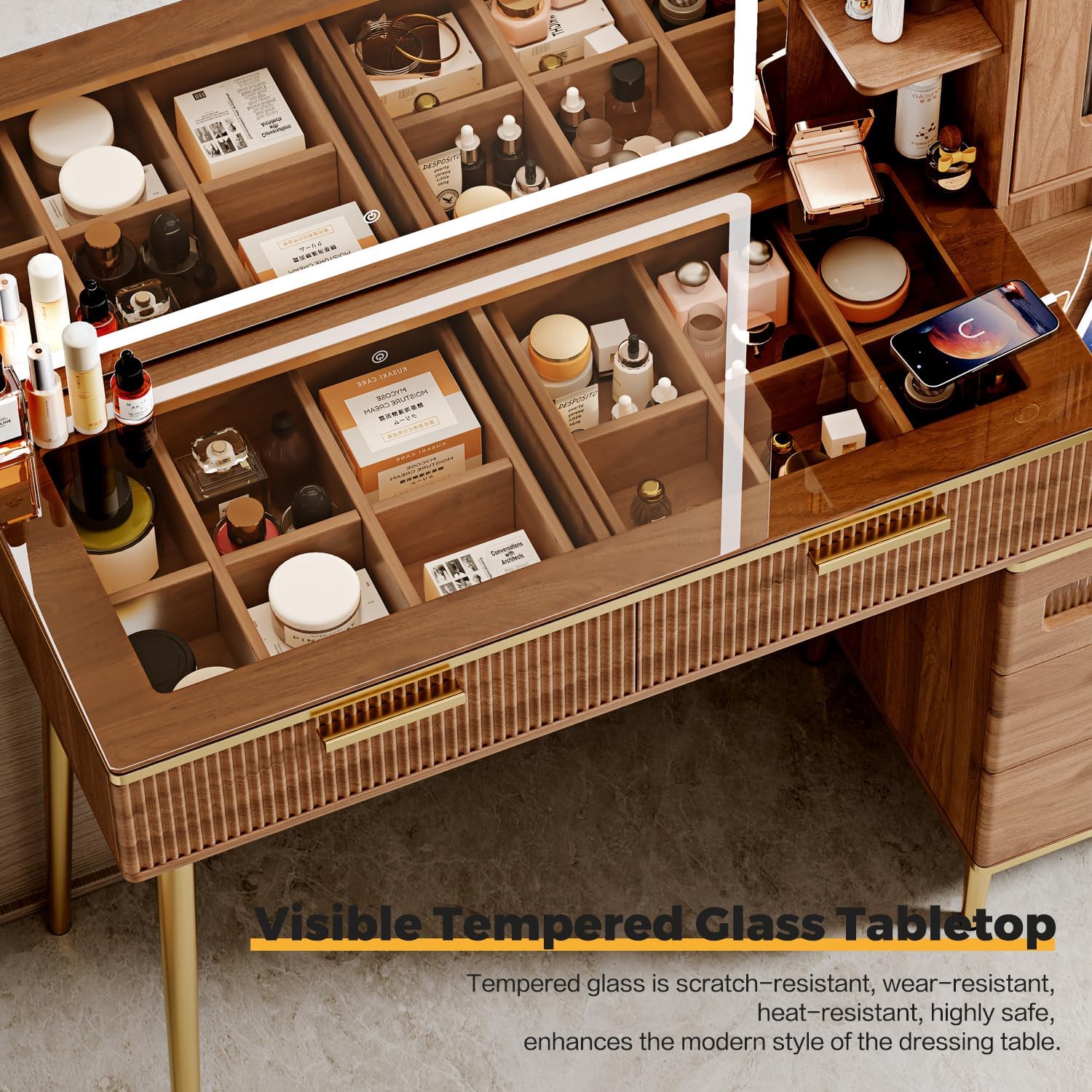 - 【Powerful Vanity Storage Space】-Are you still bothered by the fact that you have too many cosmetics and nowhere to put them? Try this makeup table with great storage function, containing 5 drawers, 3 open shelves, 2-layer hidden storage shelves with glass door, all your cosmetics and makeup tools can be sorted and stored neatly to the vanity table. Let you say goodbye to messy storage. It will be a great choice for you.
