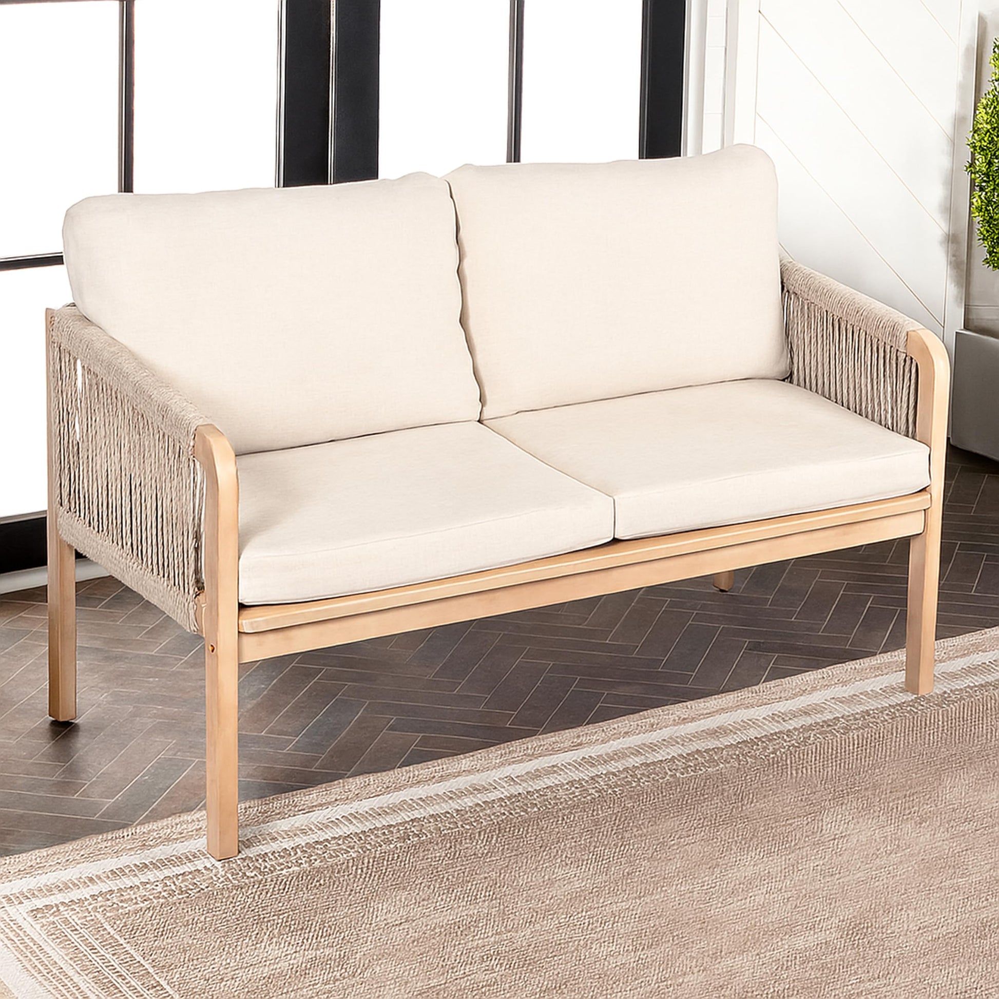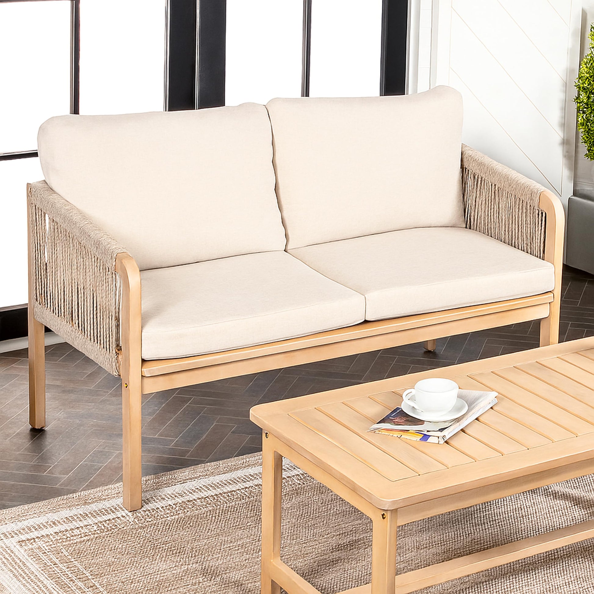 Transform your outdoor space with this modern bohemian loveseat featuring natural acacia wood construction and elegant rope detailing. The coastal-inspired design combines durability with comfort, making it perfect for patios, porches, and backyard entertaining.