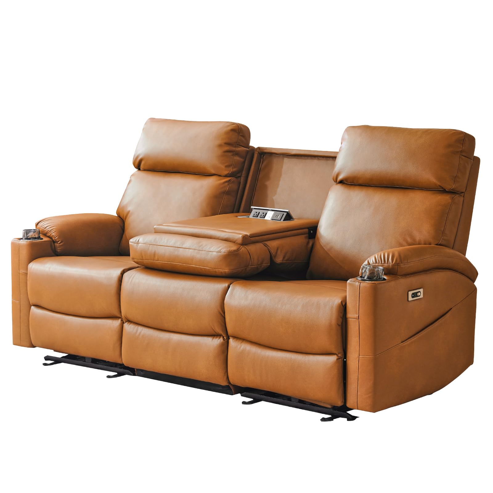 - Hidden Center Console: Revolutionize your lounging experience with our power recliner couch featuring a discreet hidden center console. Flip the middle backrest, and with a simple push of a button, watch as the console rises to reveal 2xAC outlets, 1xUSB-A port, and 1xType C port, fulfilling all your daily charging needs. In addition, the electric recliner sofa comes with two cup holders and two magazine storage bags for unparalleled convenience and storage for you and your family.