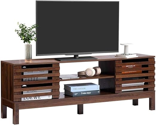 Modern entertainment center featuring bamboo construction with a rich walnut finish. This media console table offers practical storage solutions with 2 open shelves, perfect for organizing media devices, gaming consoles, and decorative items.