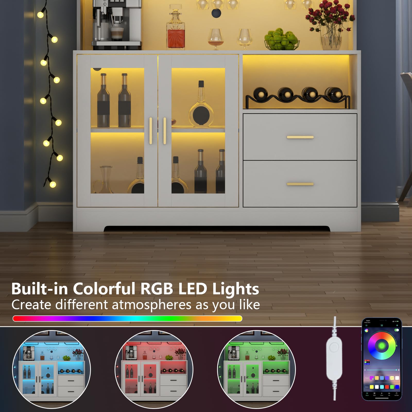 - LED Lighting & Glass Doors: Built-in LED light strip creates ambient lighting and enhances visibility. Glass cabinet doors showcase your collection while protecting bottles from dust and maintaining optimal storage conditions.