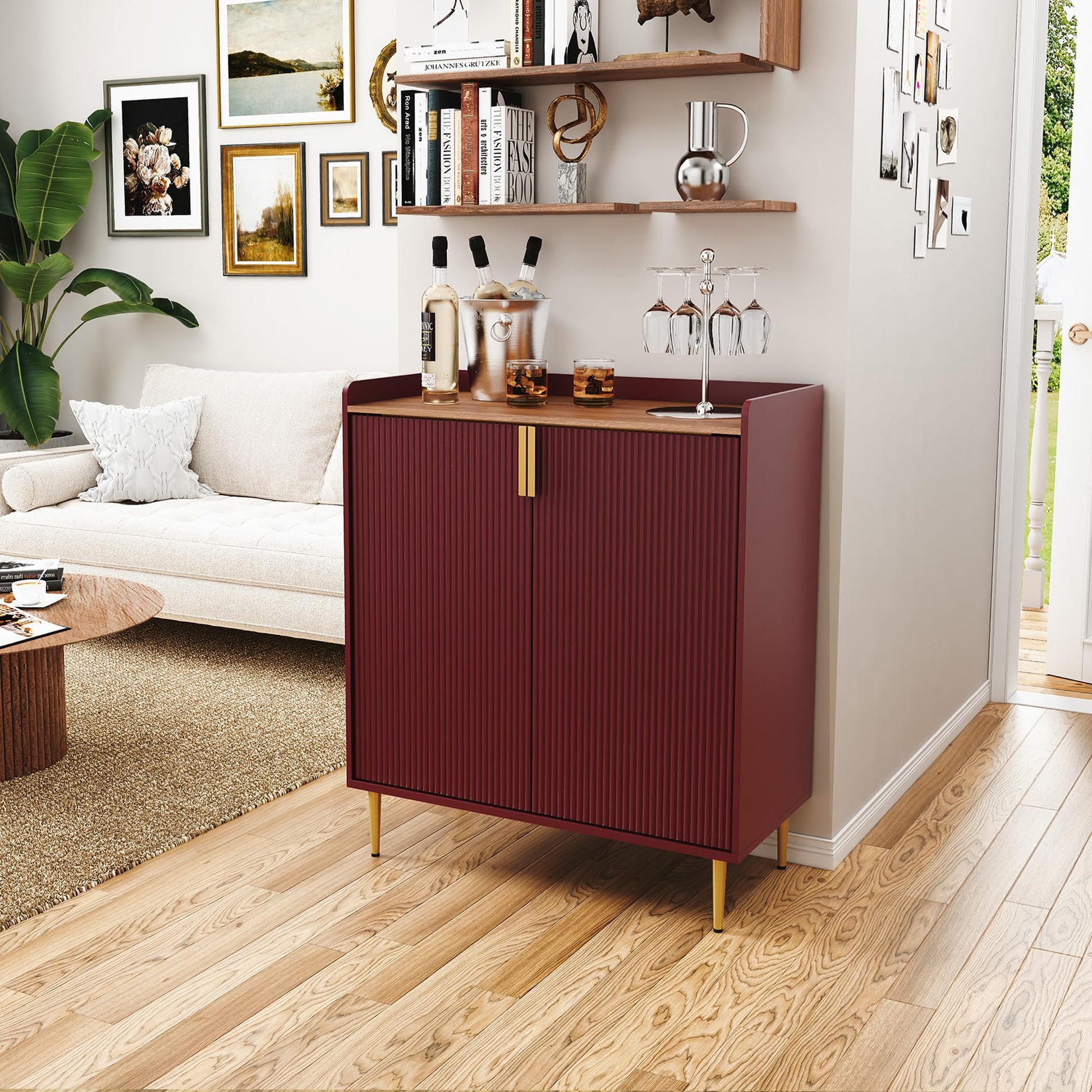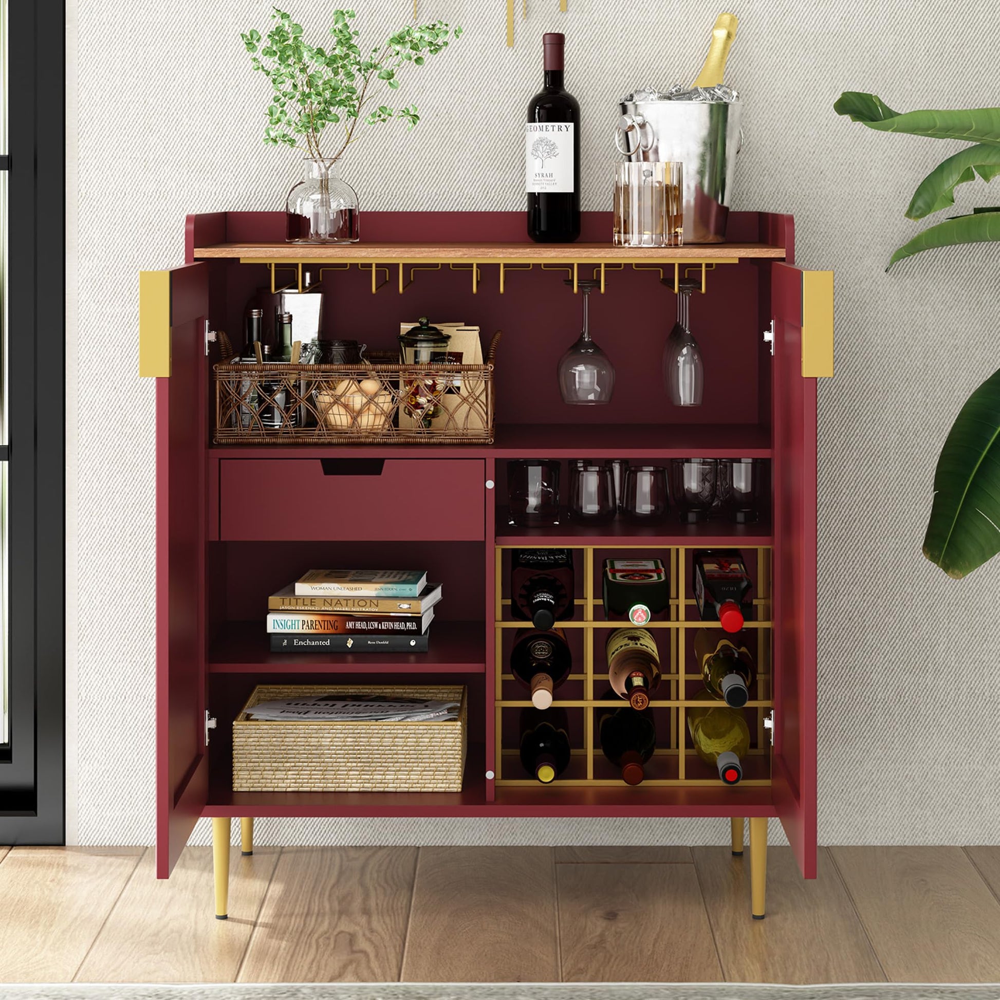 This versatile bar cabinet combines elegant design with practical functionality, perfect for organizing your home bar essentials. Featuring built-in wine storage, stemware holders, and ample cabinet space, this piece seamlessly adapts to dining rooms, kitchens, or living areas.