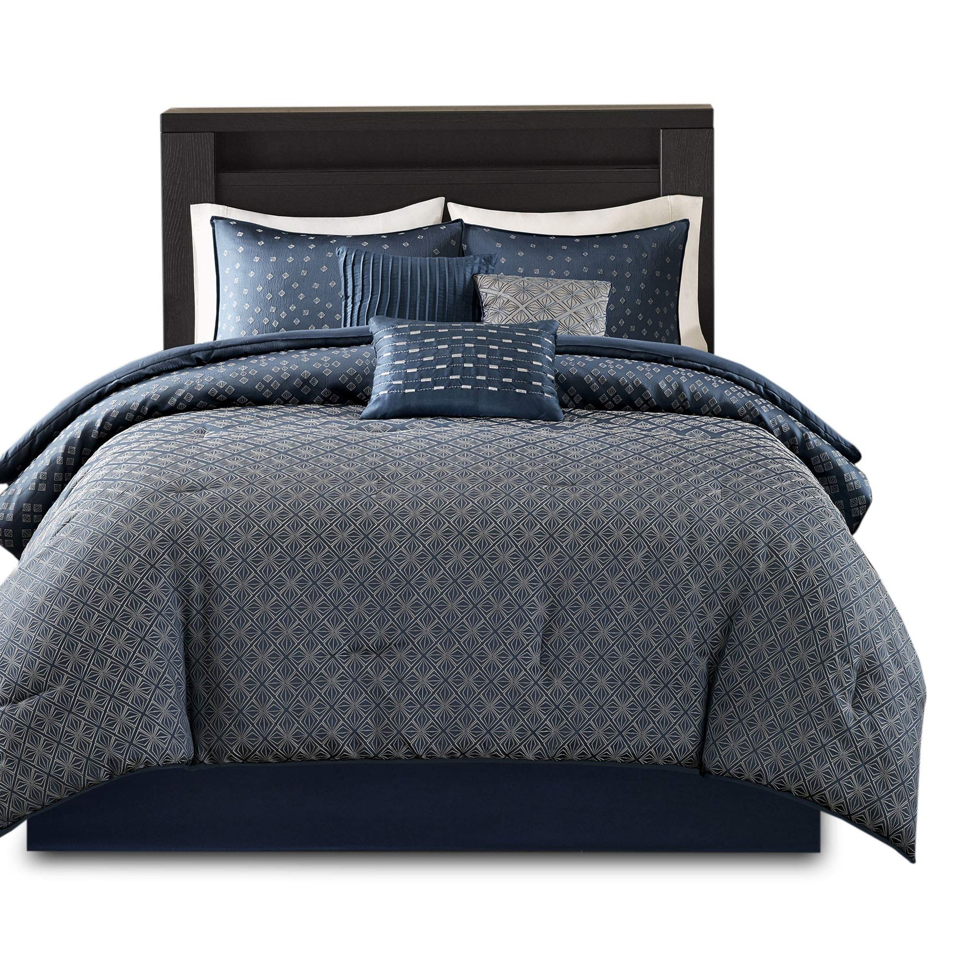 Transform your bedroom with this modern geometric jacquard comforter set. Featuring an ombre navy design, this all-season down alternative bedding provides cozy comfort year-round. The set includes a comforter, matching shams, and decorative pillow for a complete bedroom refresh.