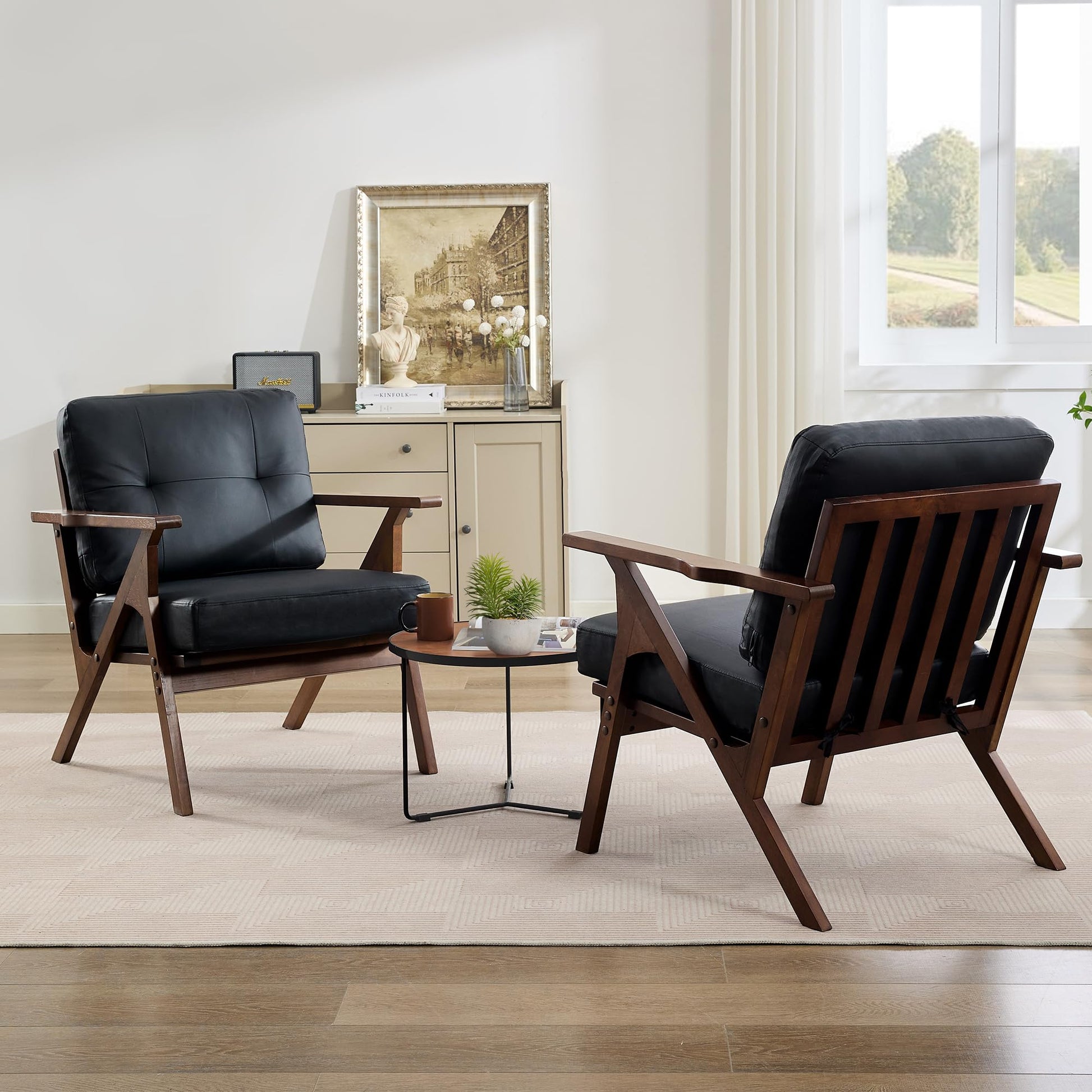 Mid-century modern office lounge chairs featuring premium black leather upholstery and elegant wooden arms. This set of 2 accent chairs combines timeless design with exceptional comfort, perfect for living rooms, waiting areas, or office spaces.
