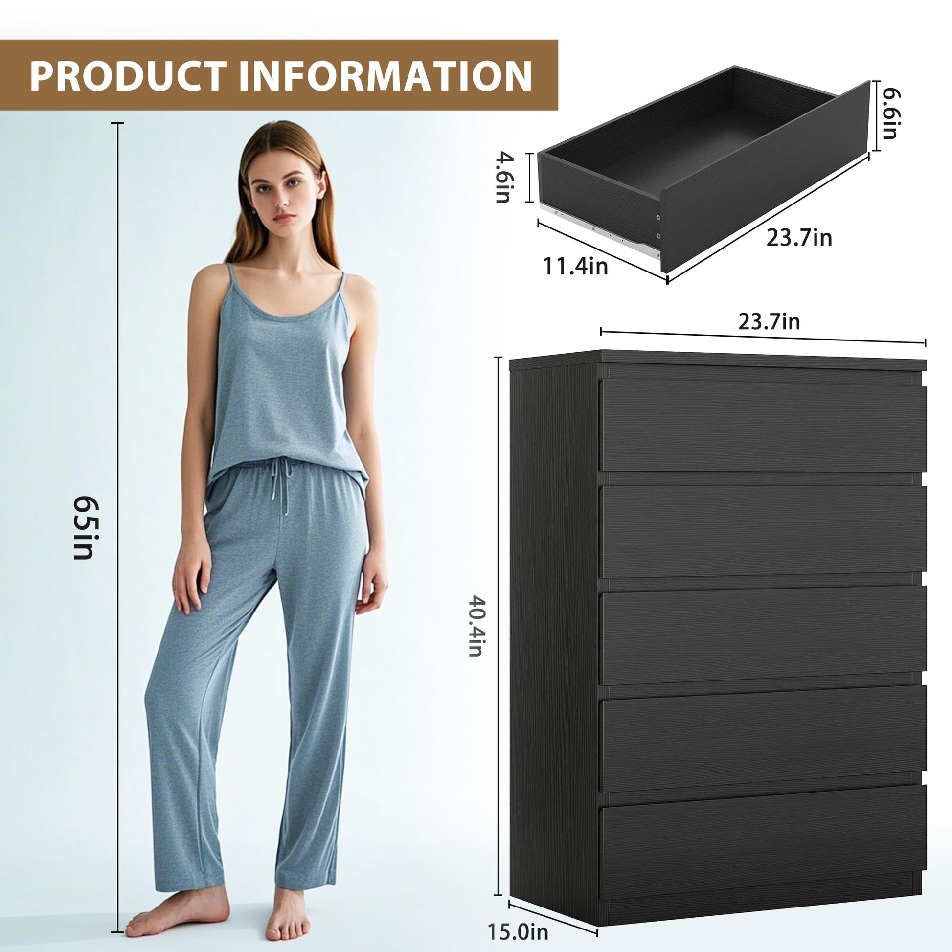 This modern 5-drawer dresser combines sleek design with practical storage for bedroom, living room, hallway, or entryway spaces. Crafted from durable wood with a sophisticated black finish, this chest of drawers features deep drawers that provide ample storage capacity for clothing, linens, and household items.