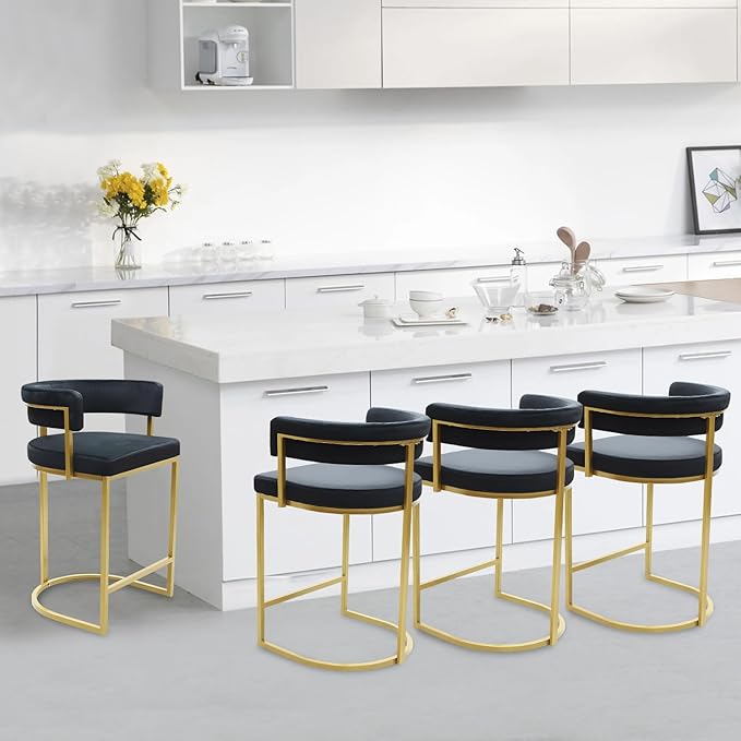 Elevate your home bar, kitchen island, or counter space with this sophisticated set of three black velvet bar stools. Featuring a contemporary barrel backrest design and elegant gold metal footrest, these stools combine comfort with modern aesthetics.