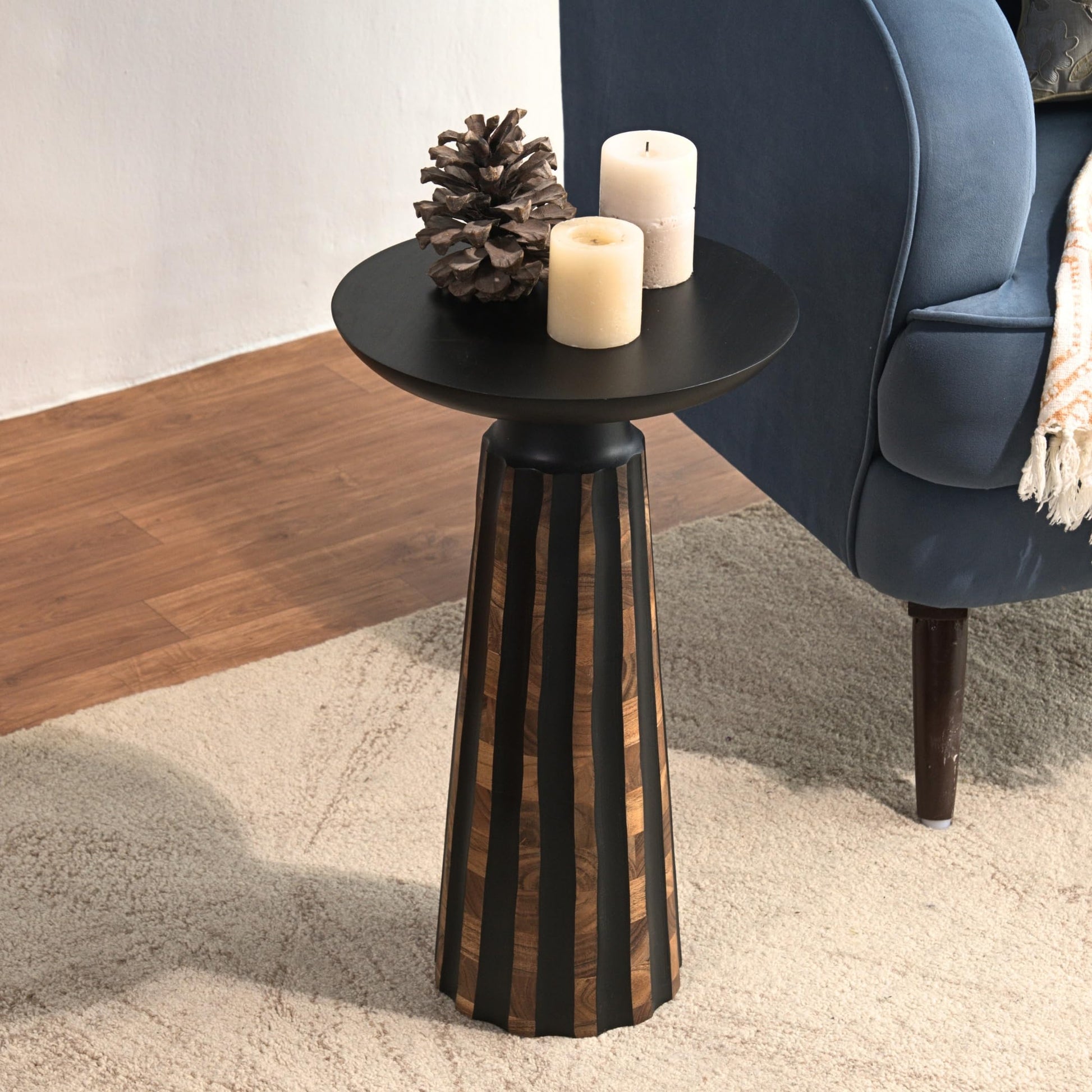 Black & Walnut Wood Drum Pedestal Accent Table