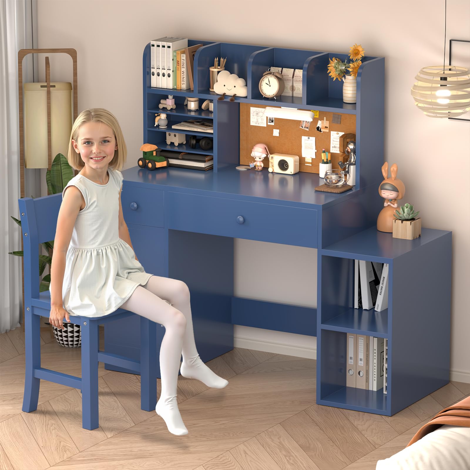This functional kids study desk and chair set provides a dedicated workspace for children to study, read, and draw. Constructed from engineered wood with a solid pine wood chair, this furniture set combines durability with practical storage solutions.