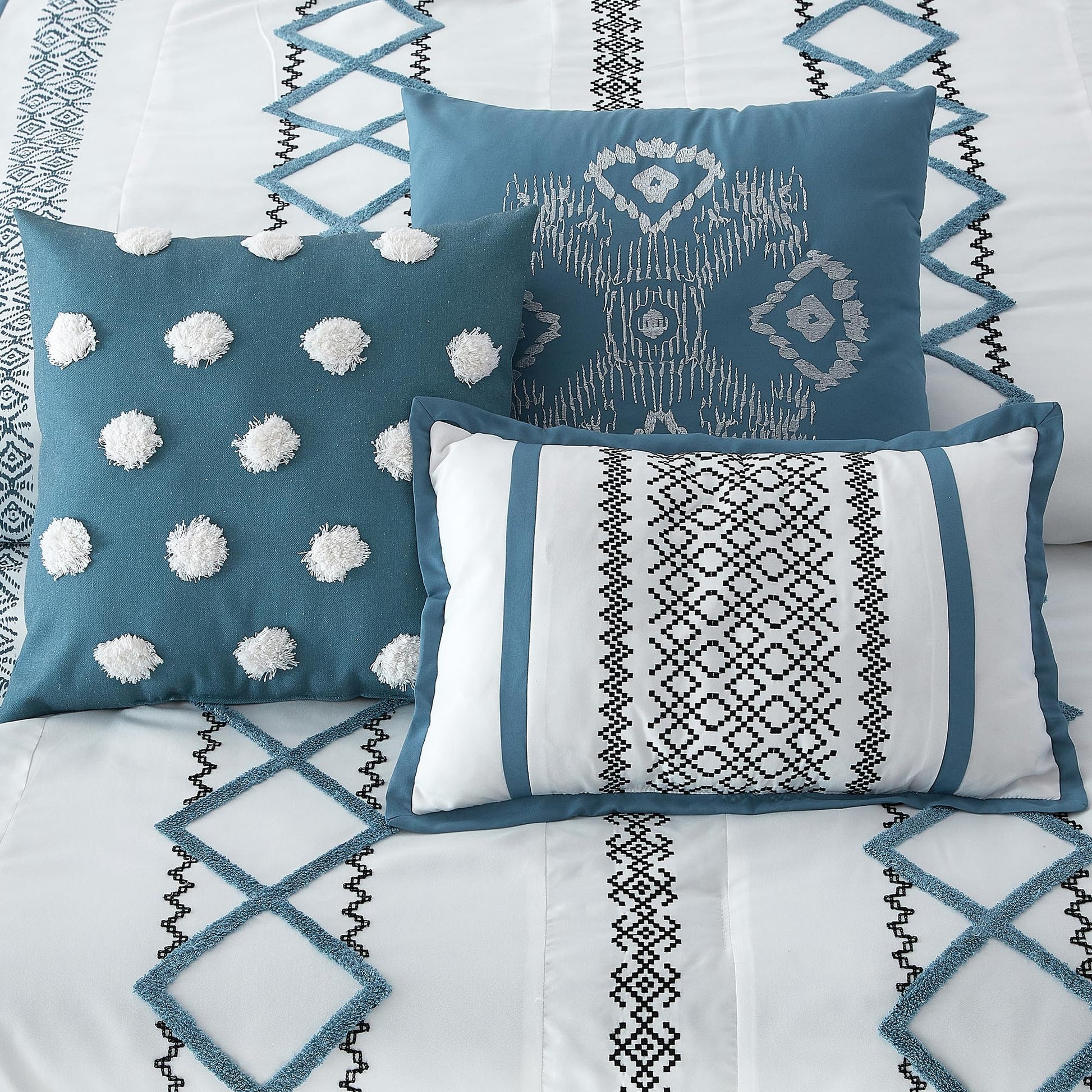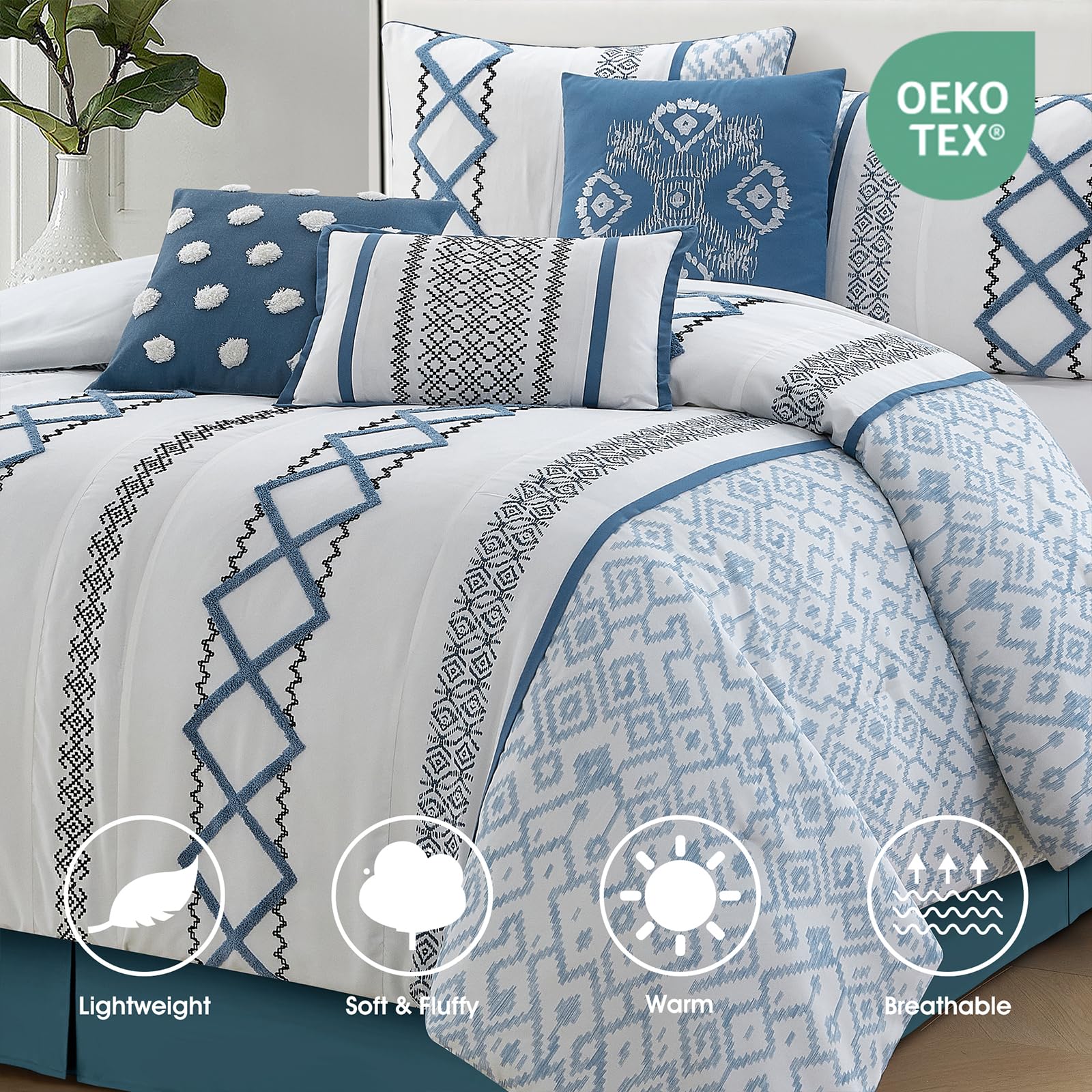 Blue Queen Comforter Set 7-Piece Geometric Embroidered Bedding