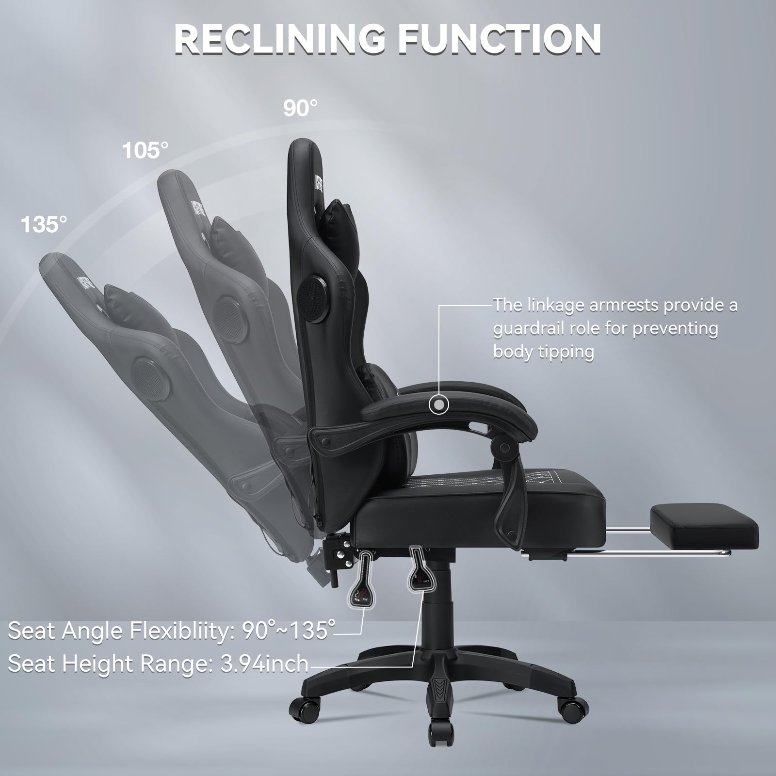 Ergonomic gaming chair featuring dual Bluetooth 5.3 speakers, USB-powered massage function, and retractable footrest. Designed for extended gaming sessions, office work, and relaxation with premium comfort and advanced features.
