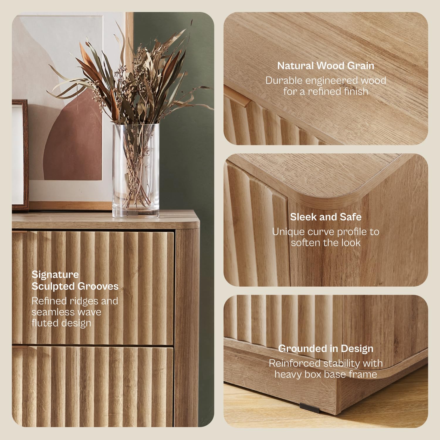 - Versatile use as dresser, nightstand, or storage console
