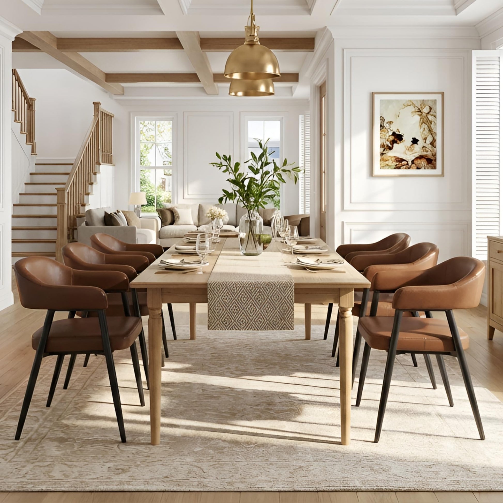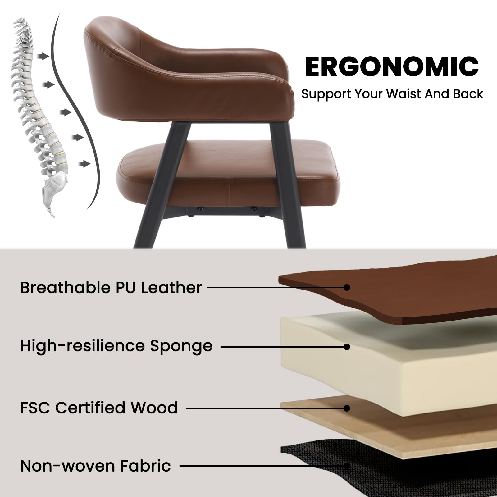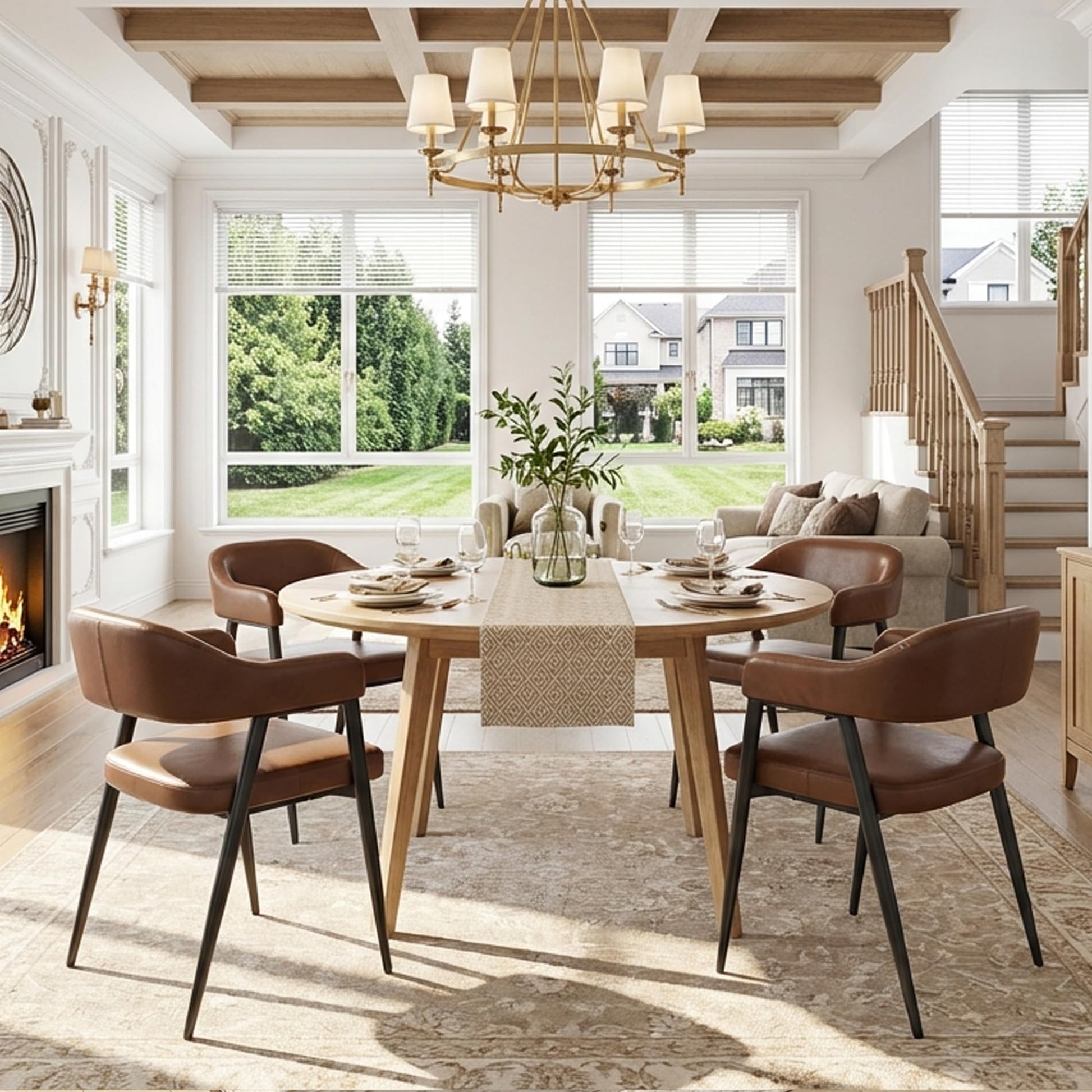 Elevate your dining space with this set of four mid-century modern dining chairs featuring premium brown leather upholstery and sleek black metal legs. The curved backrest design provides exceptional comfort and support, while the low-back armrest style adds a contemporary accent to any dining room, kitchen, or bar area.