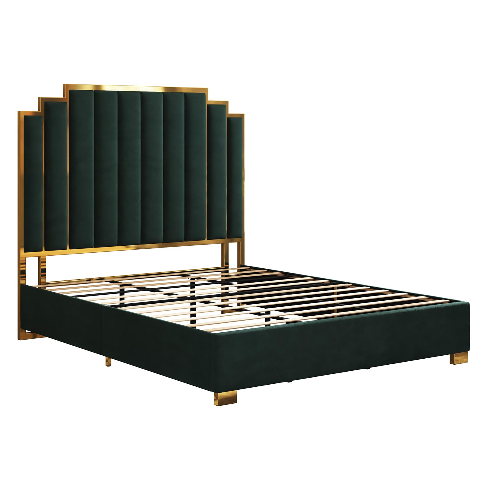 California King Upholstered Bed Frame - Velvet Platform Bed with Gold Trim Headboard