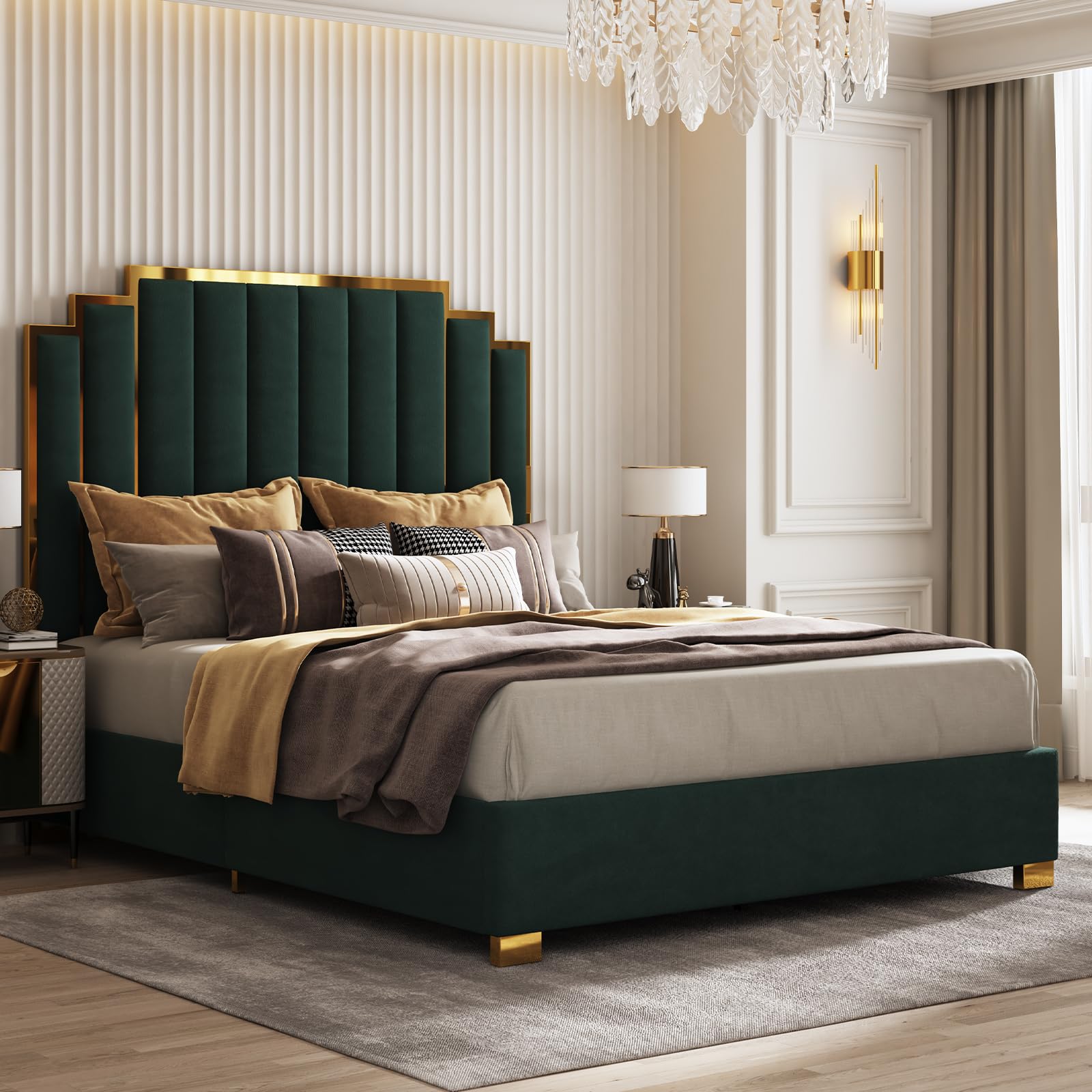 Elevate your bedroom with this luxurious California King upholstered platform bed frame. Featuring a striking 65.4" tall headboard with vertical channel tufting and elegant gold metal trim, this modern bed combines sophisticated style with practical functionality.