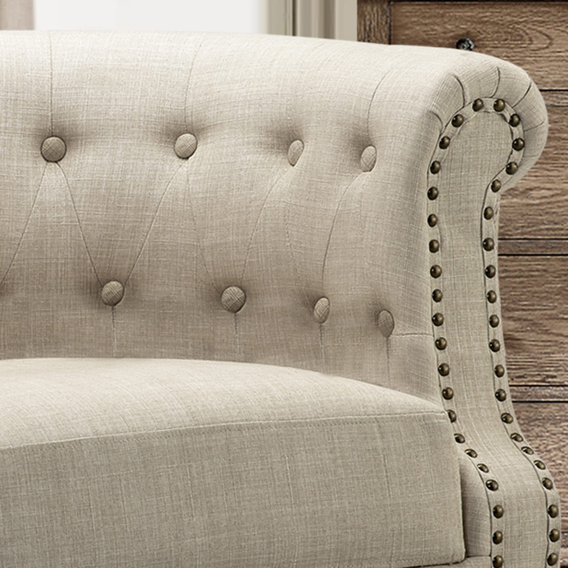 - Hand-pulled tufted buttons with silver-toned nailhead accents